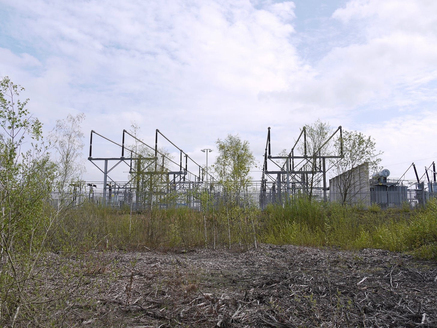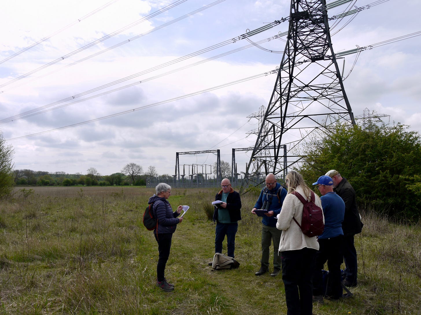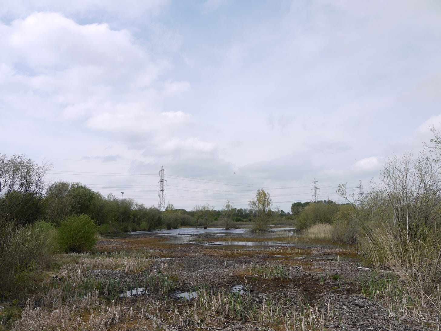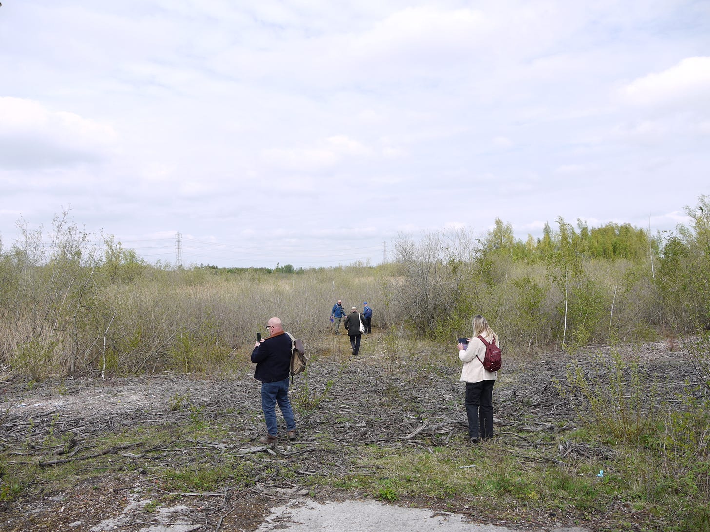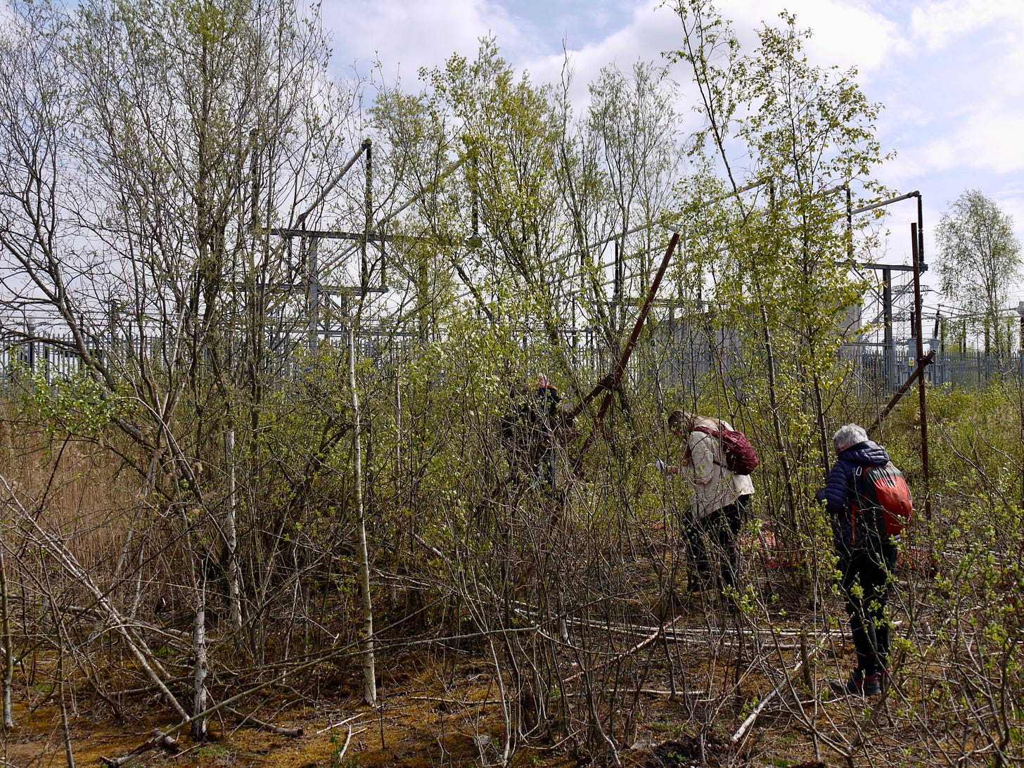 ​On Saturday 19 April, I joined a small group of walkers and writers for a collaborative ramble in the traces of Thorpe Marsh, a former coal-fired power station in the flatlands north of Doncaster. This peripatetic workshop, led by poet Steve Ely, threaded between settling ponds and cloud-skimming pylons, stands of white birches and shards of anthracite coal. I'd visited Thorpe Marsh once before, also with Steve, in April 2022. When I returned three years later, and contemplated the site from the access gate, it seemed to have shrunk; after an hour or so of collective walking, crouching by a rusted pipe in which countless bees were nesting, surveying half-collapsed heaps of crushed brick and concrete, or gazing at the terminal towers of the electrical substation, I'd recovered my orientation and sense of scale.