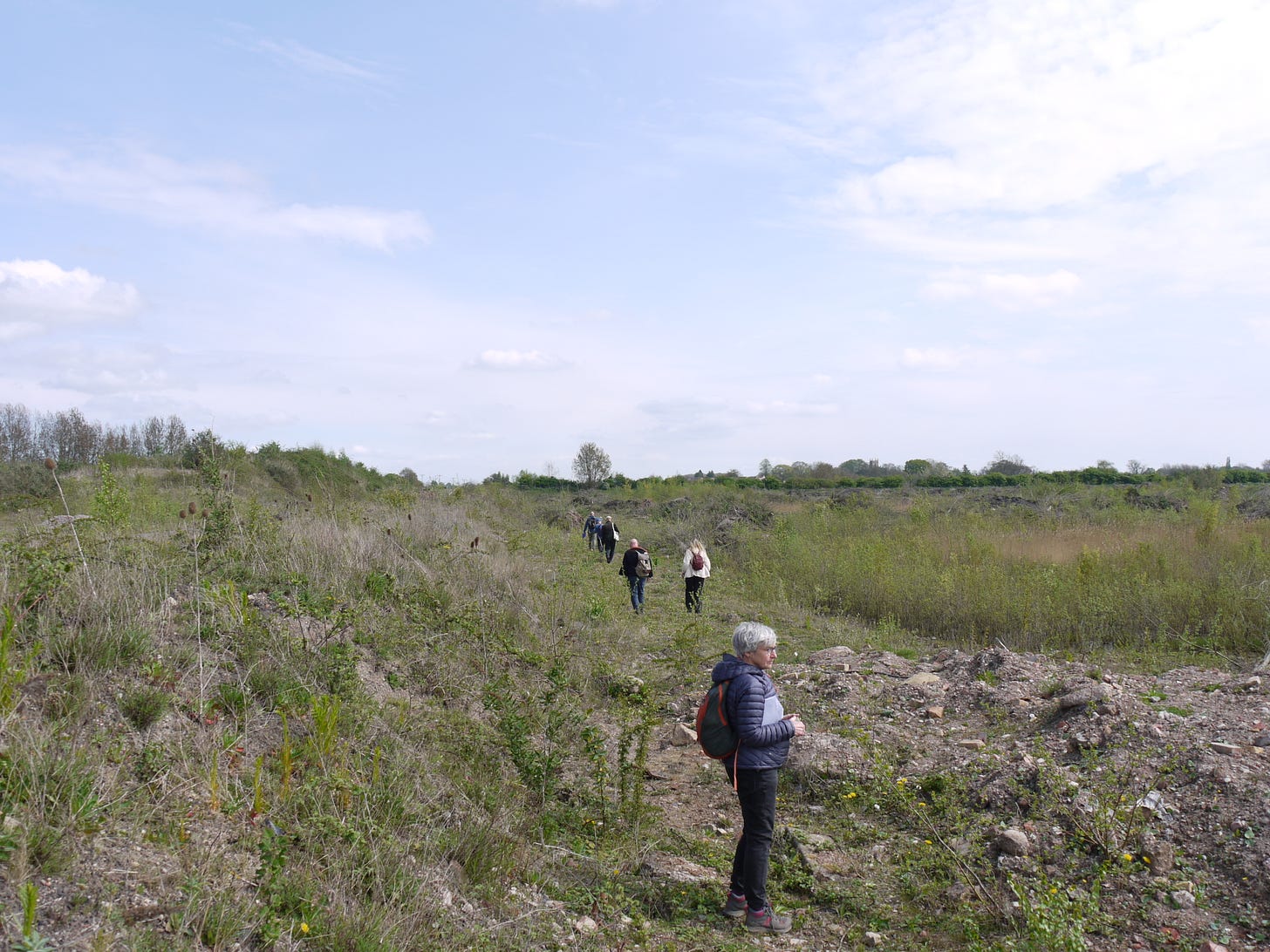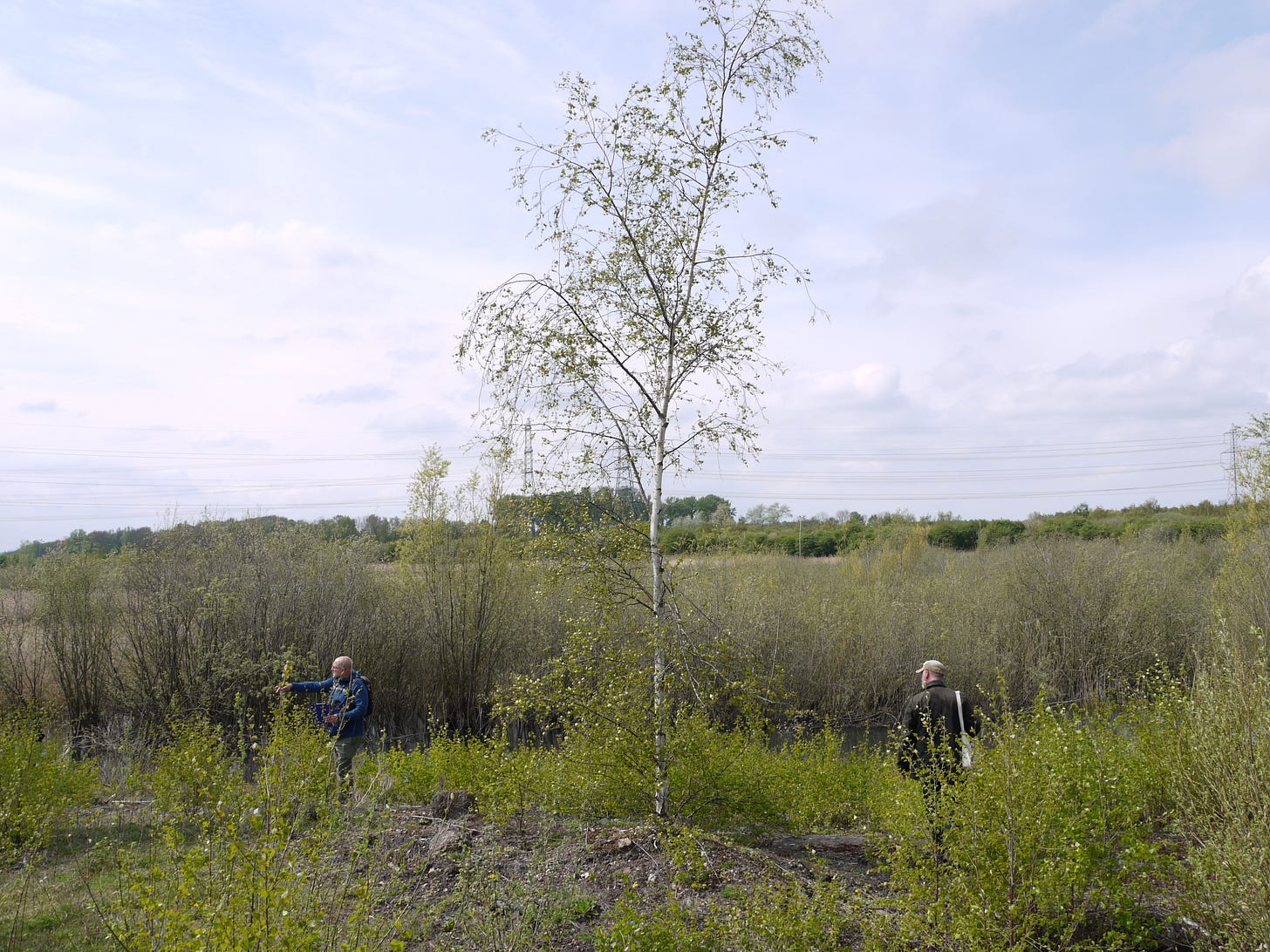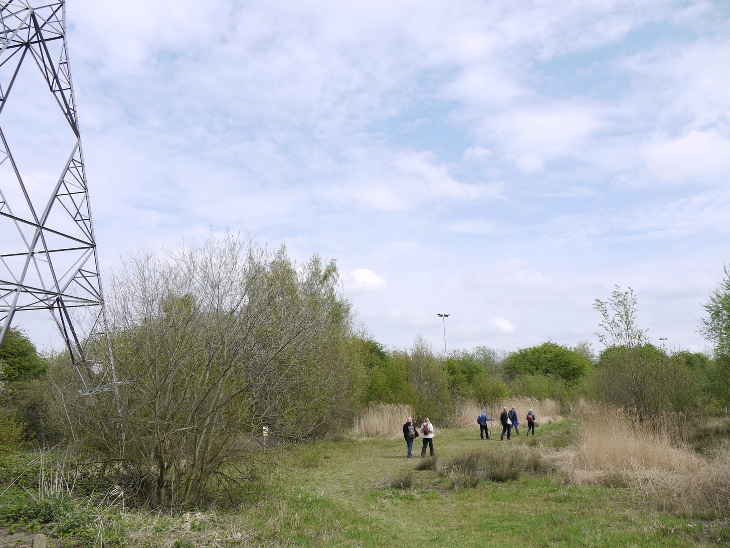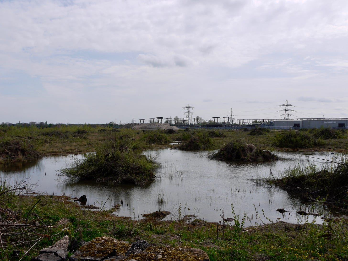 ​On Saturday 19 April, I joined a small group of walkers and writers for a collaborative ramble in the traces of Thorpe Marsh, a former coal-fired power station in the flatlands north of Doncaster. This peripatetic workshop, led by poet Steve Ely, threaded between settling ponds and cloud-skimming pylons, stands of white birches and shards of anthracite coal. I'd visited Thorpe Marsh once before, also with Steve, in April 2022. When I returned three years later, and contemplated the site from the access gate, it seemed to have shrunk; after an hour or so of collective walking, crouching by a rusted pipe in which countless bees were nesting, surveying half-collapsed heaps of crushed brick and concrete, or gazing at the terminal towers of the electrical substation, I'd recovered my orientation and sense of scale.