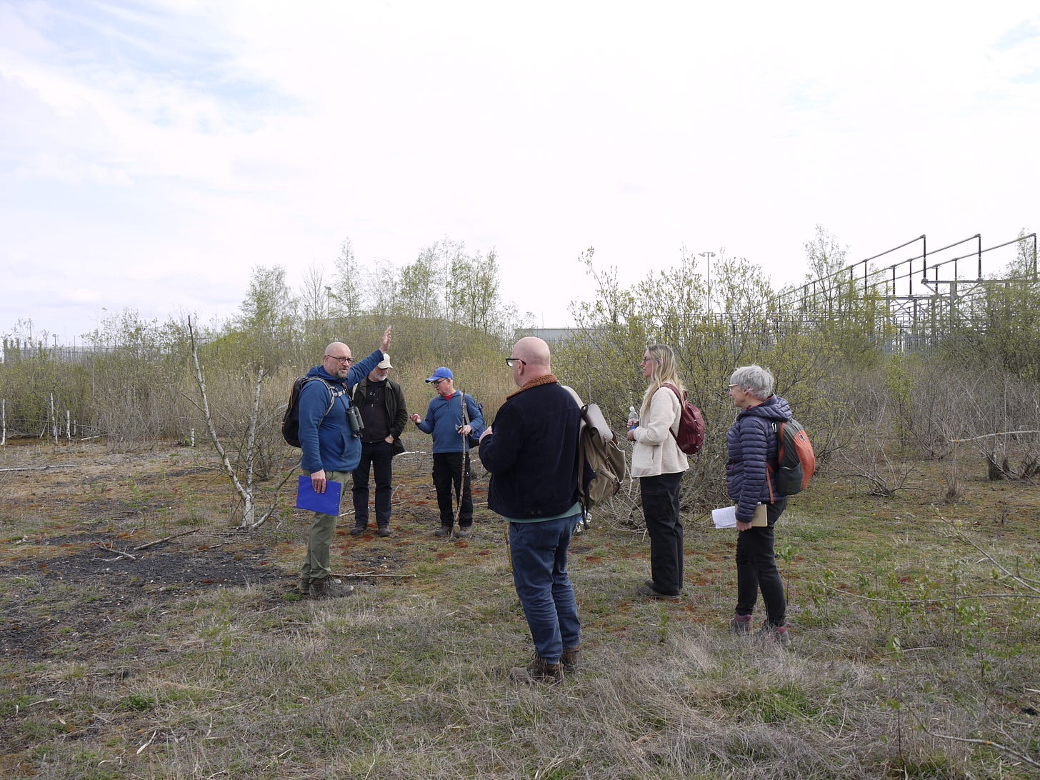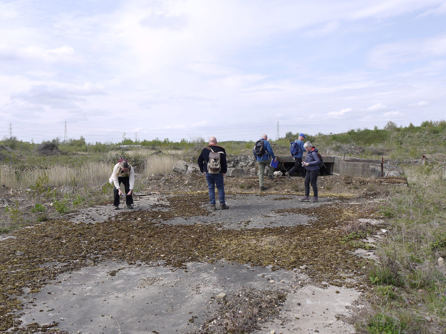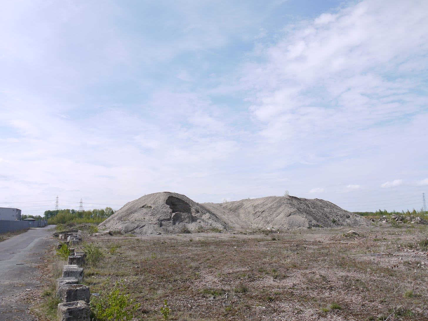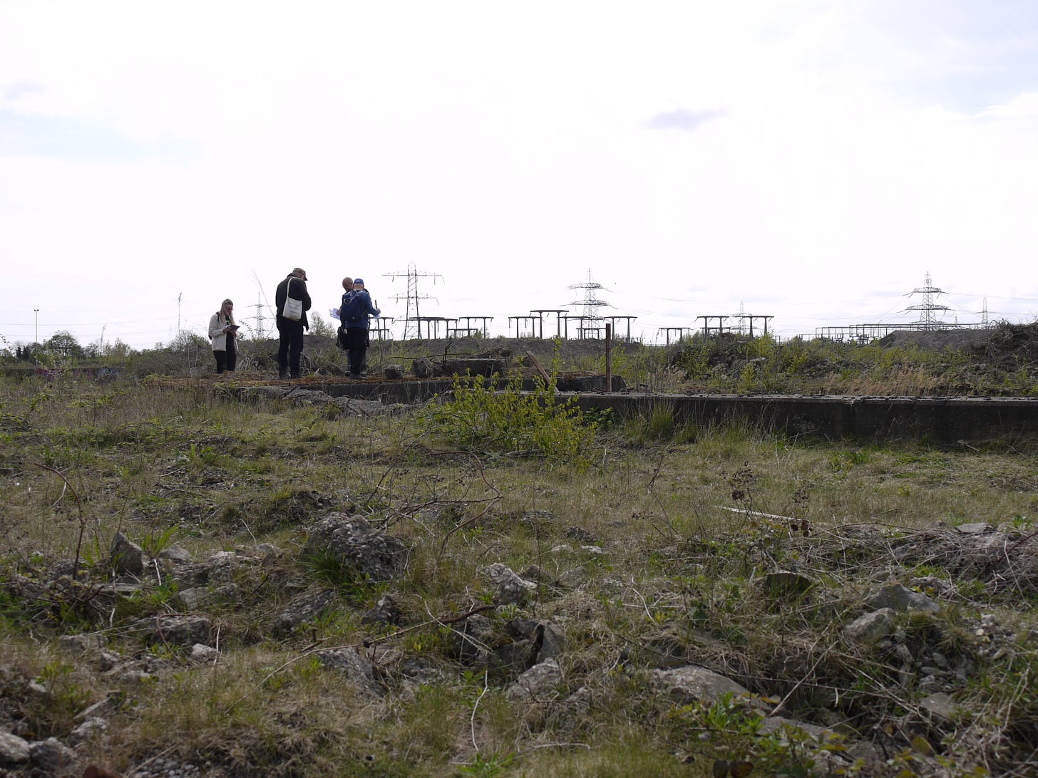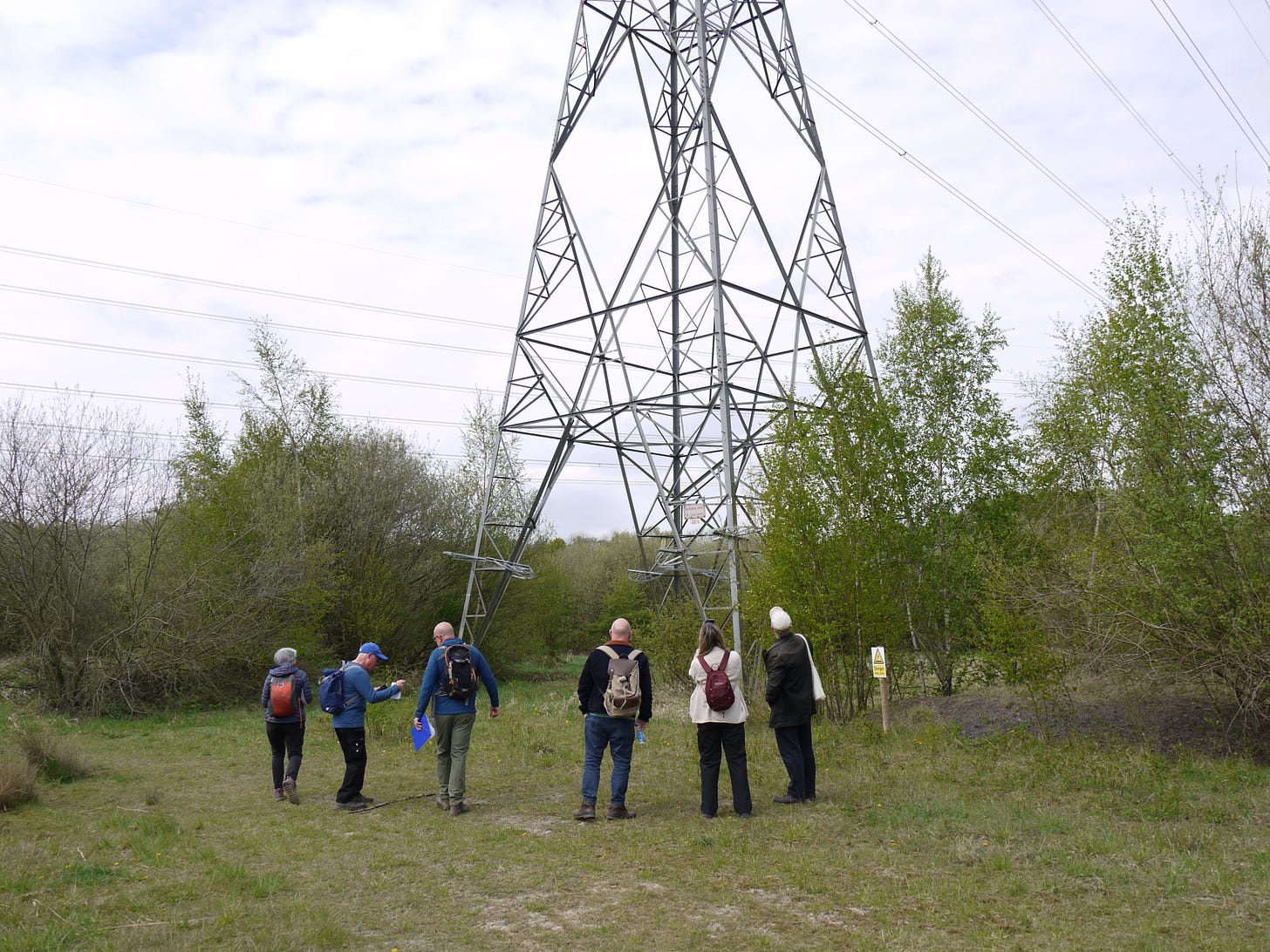 ​On Saturday 19 April, I joined a small group of walkers and writers for a collaborative ramble in the traces of Thorpe Marsh, a former coal-fired power station in the flatlands north of Doncaster. This peripatetic workshop, led by poet Steve Ely, threaded between settling ponds and cloud-skimming pylons, stands of white birches and shards of anthracite coal. I'd visited Thorpe Marsh once before, also with Steve, in April 2022. When I returned three years later, and contemplated the site from the access gate, it seemed to have shrunk; after an hour or so of collective walking, crouching by a rusted pipe in which countless bees were nesting, surveying half-collapsed heaps of crushed brick and concrete, or gazing at the terminal towers of the electrical substation, I'd recovered my orientation and sense of scale.