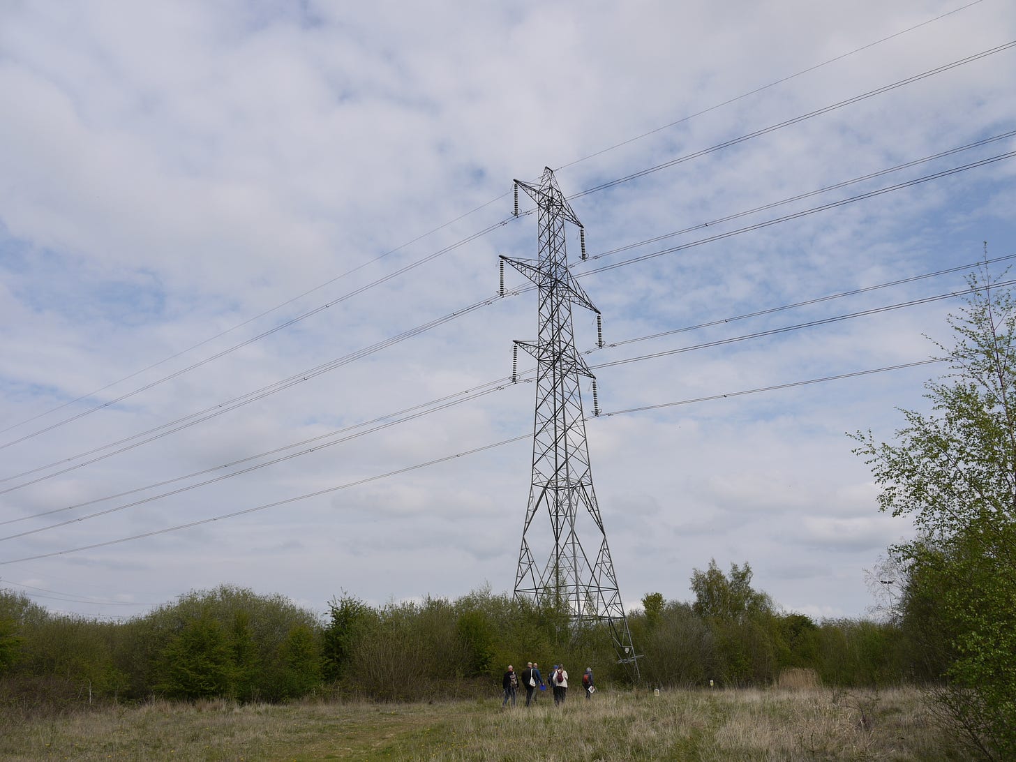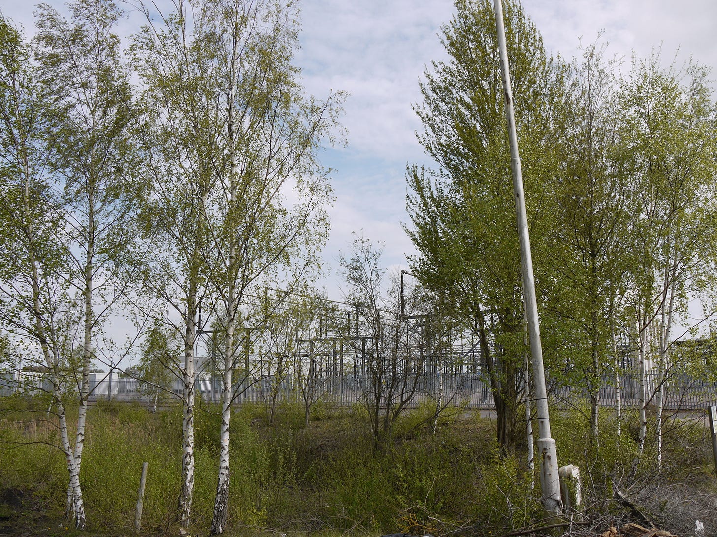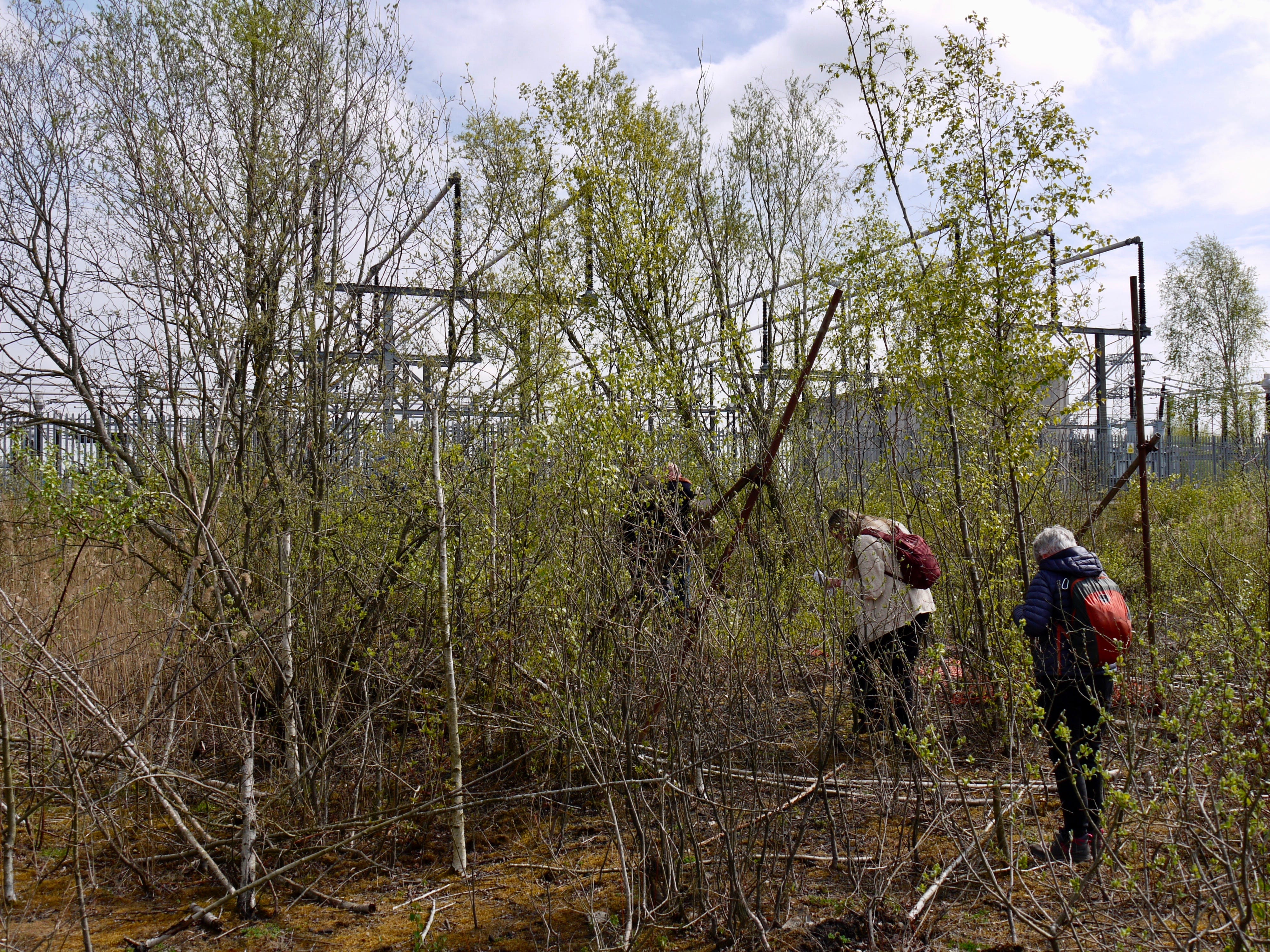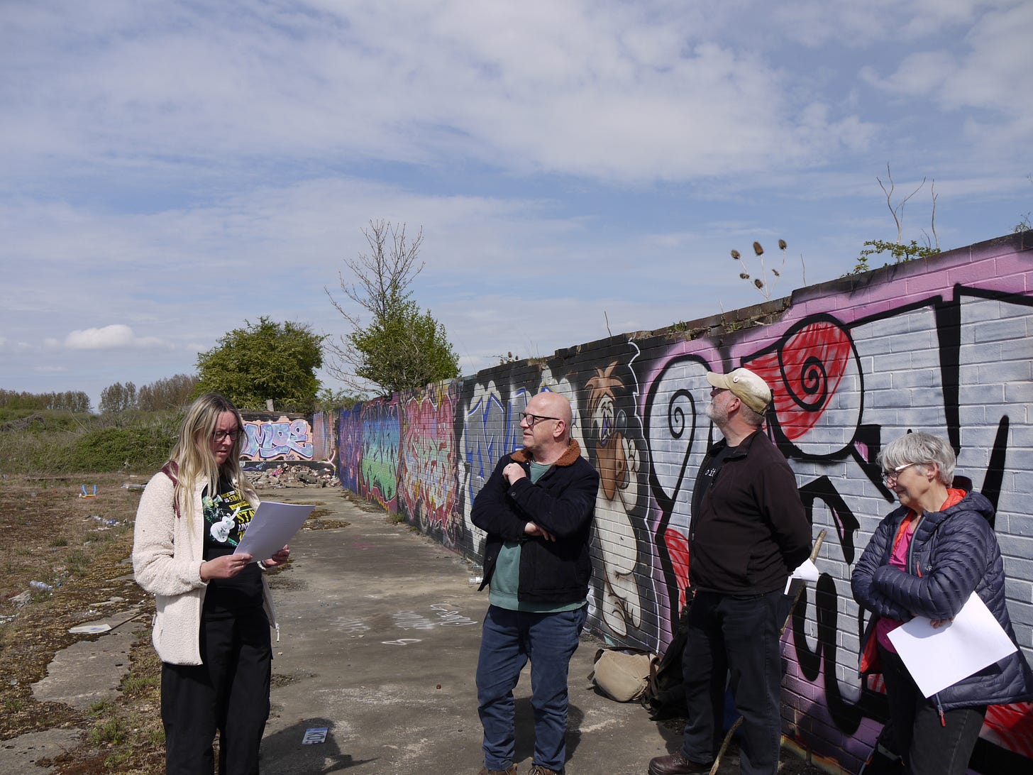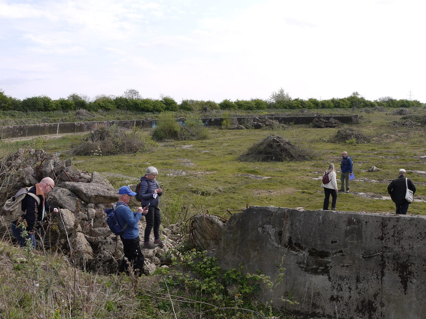 ​On Saturday 19 April, I joined a small group of walkers and writers for a collaborative ramble in the traces of Thorpe Marsh, a former coal-fired power station in the flatlands north of Doncaster. This peripatetic workshop, led by poet Steve Ely, threaded between settling ponds and cloud-skimming pylons, stands of white birches and shards of anthracite coal. I'd visited Thorpe Marsh once before, also with Steve, in April 2022. When I returned three years later, and contemplated the site from the access gate, it seemed to have shrunk; after an hour or so of collective walking, crouching by a rusted pipe in which countless bees were nesting, surveying half-collapsed heaps of crushed brick and concrete, or gazing at the terminal towers of the electrical substation, I'd recovered my orientation and sense of scale.