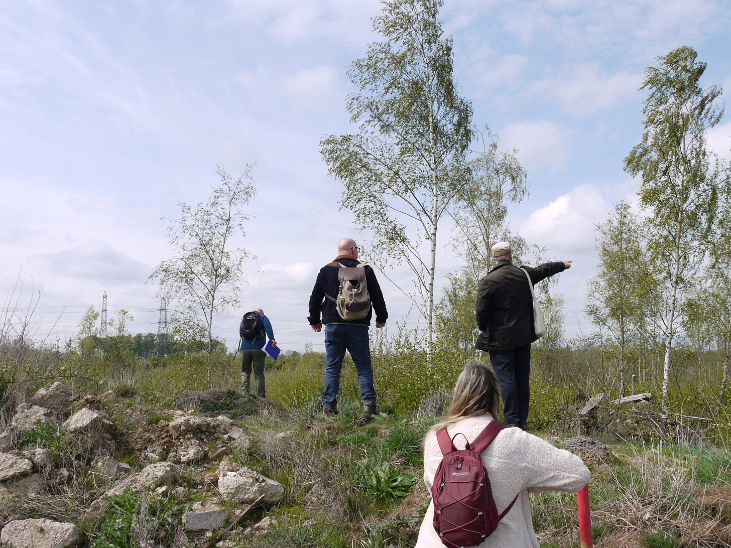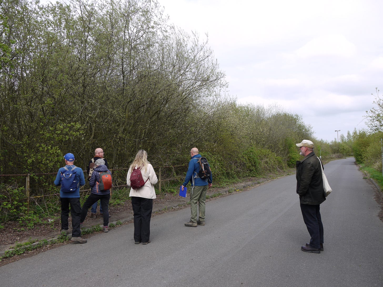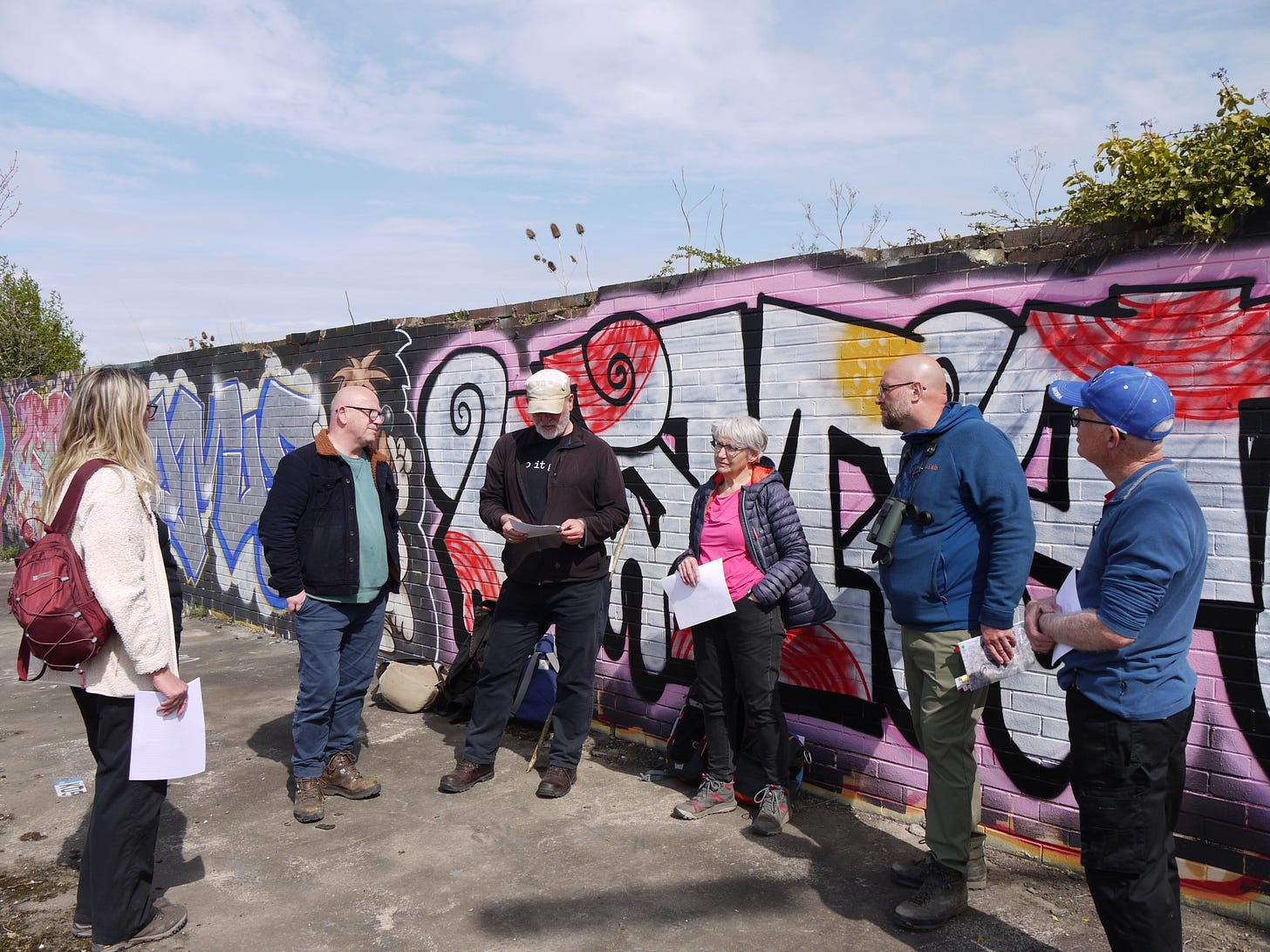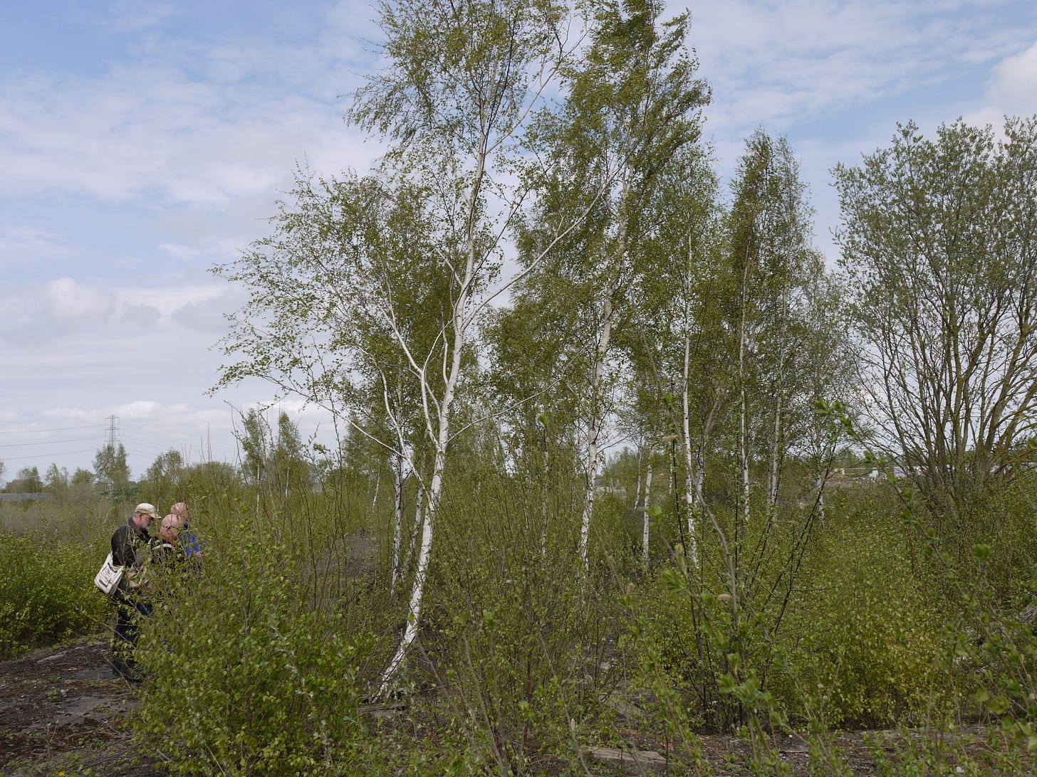 ​On Saturday 19 April, I joined a small group of walkers and writers for a collaborative ramble in the traces of Thorpe Marsh, a former coal-fired power station in the flatlands north of Doncaster. This peripatetic workshop, led by poet Steve Ely, threaded between settling ponds and cloud-skimming pylons, stands of white birches and shards of anthracite coal. I'd visited Thorpe Marsh once before, also with Steve, in April 2022. When I returned three years later, and contemplated the site from the access gate, it seemed to have shrunk; after an hour or so of collective walking, crouching by a rusted pipe in which countless bees were nesting, surveying half-collapsed heaps of crushed brick and concrete, or gazing at the terminal towers of the electrical substation, I'd recovered my orientation and sense of scale.