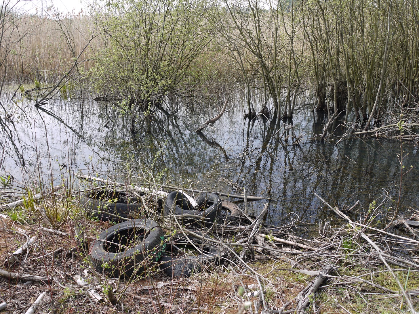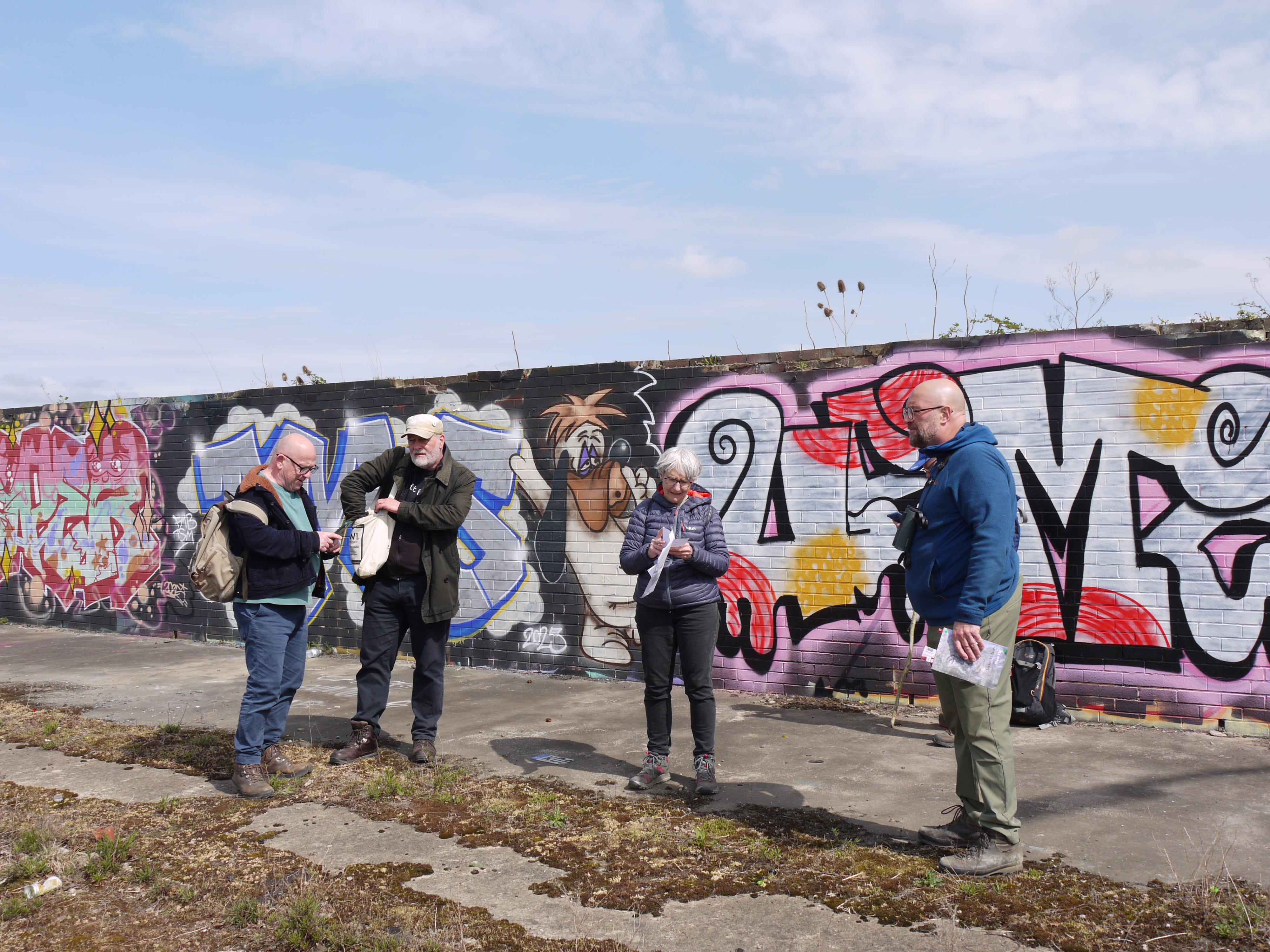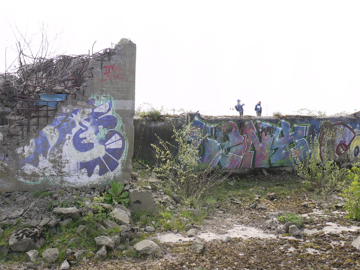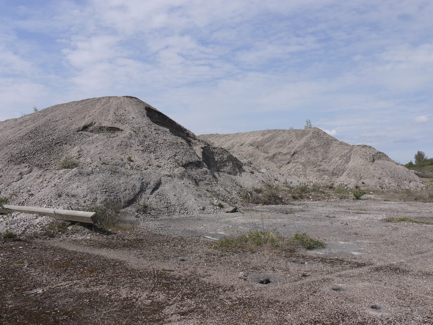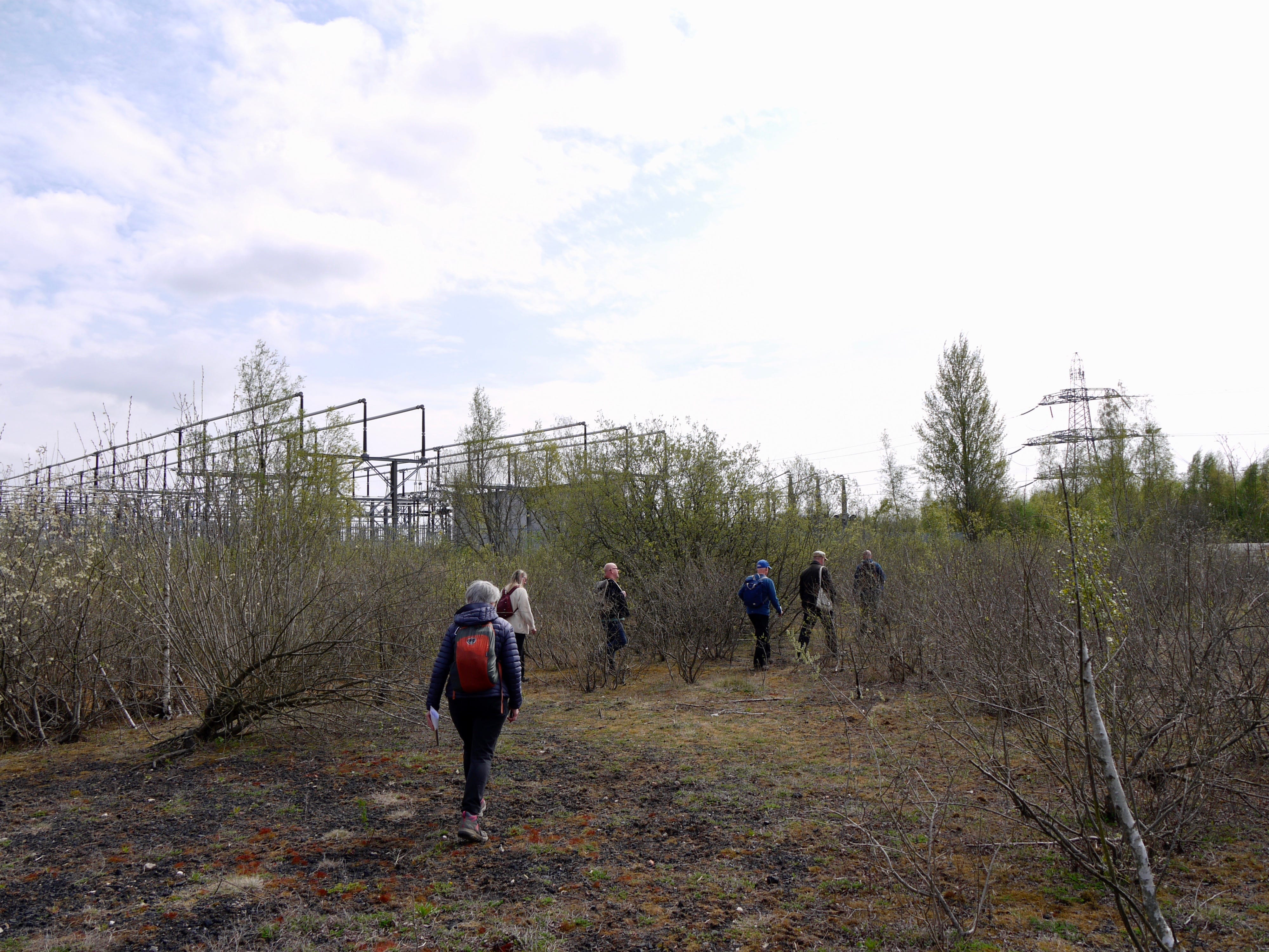 ​On Saturday 19 April, I joined a small group of walkers and writers for a collaborative ramble in the traces of Thorpe Marsh, a former coal-fired power station in the flatlands north of Doncaster. This peripatetic workshop, led by poet Steve Ely, threaded between settling ponds and cloud-skimming pylons, stands of white birches and shards of anthracite coal. I'd visited Thorpe Marsh once before, also with Steve, in April 2022. When I returned three years later, and contemplated the site from the access gate, it seemed to have shrunk; after an hour or so of collective walking, crouching by a rusted pipe in which countless bees were nesting, surveying half-collapsed heaps of crushed brick and concrete, or gazing at the terminal towers of the electrical substation, I'd recovered my orientation and sense of scale.