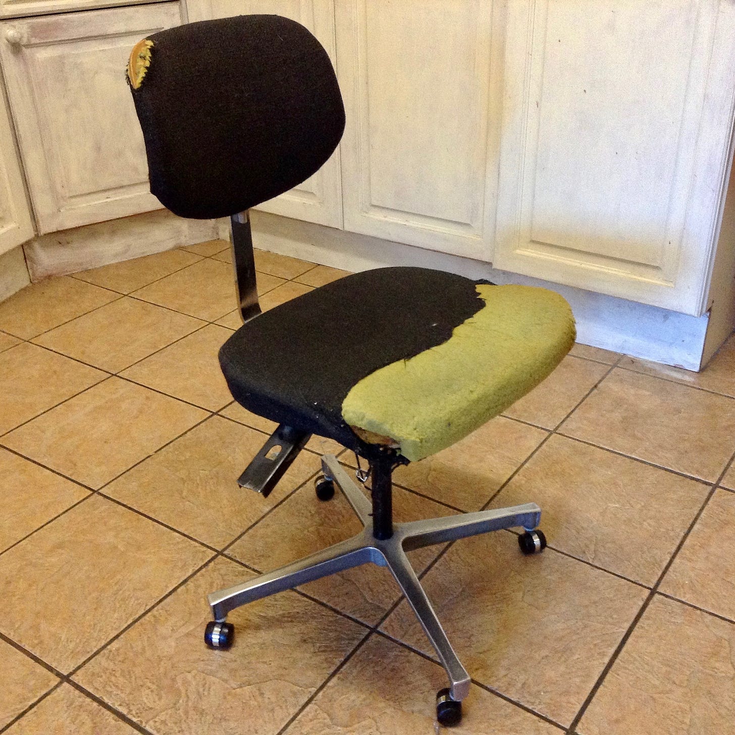 The Longbarrow office chair, acquired for £1 in the 1990s, and now, after several decades, past expiry, yet still in service. Is it stubbornness, stinginess, or sentiment that keeps it from the scrapheap. The chair is held together by two bent screws and a buckled metal plate and falls apart every few days.