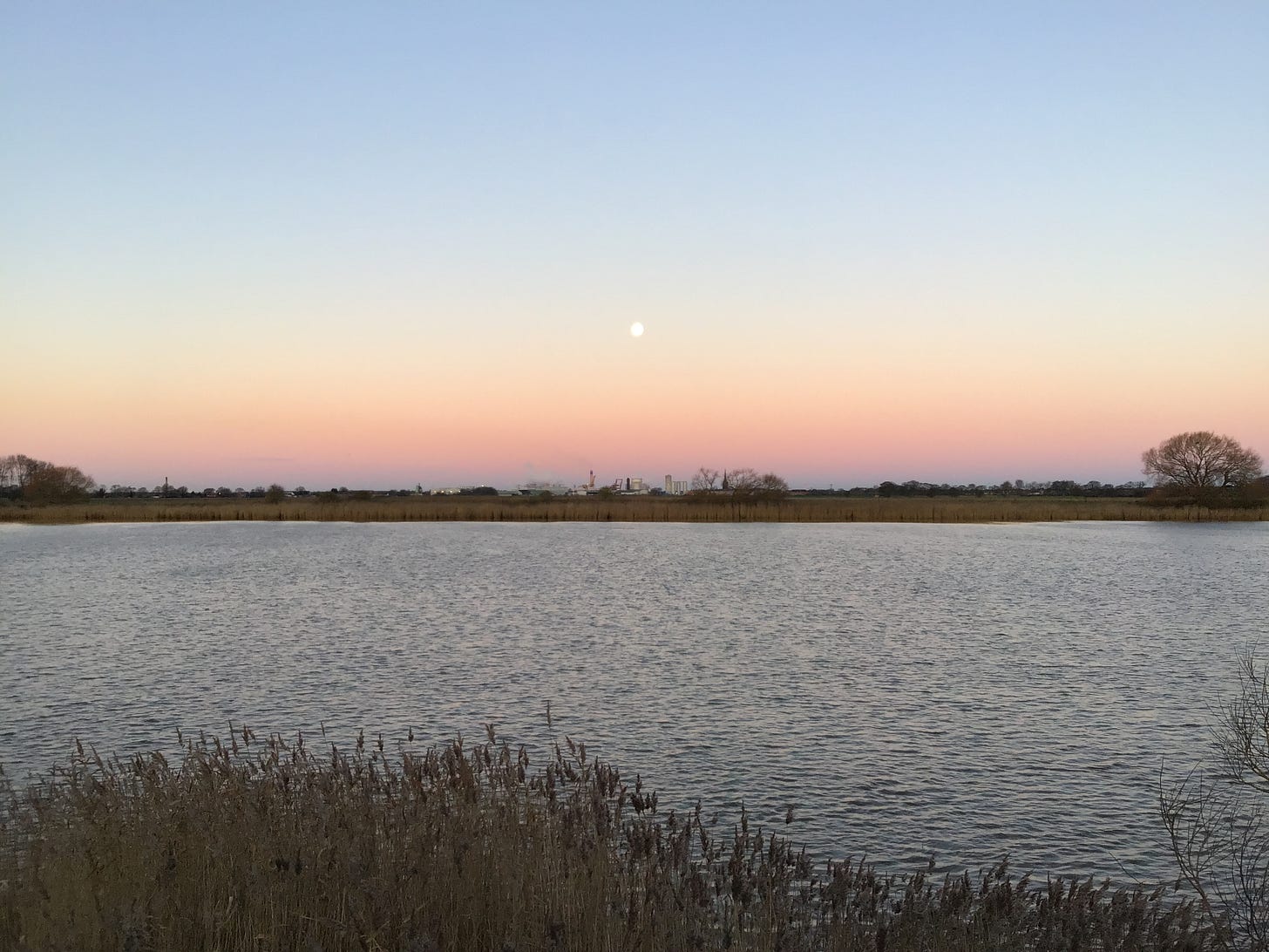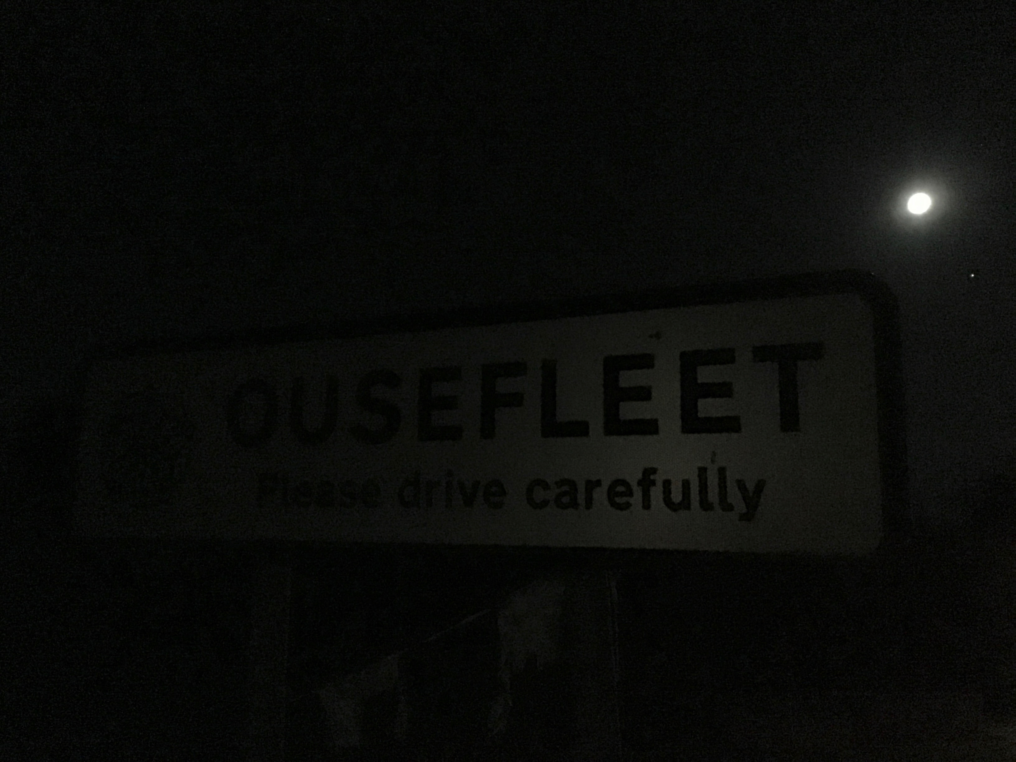 I get out of the village. An owl calls from the fields. The road bends back in the crook of the land then straightens out again. Alkborough rising in the north-east. I track the green lights and the distant ridge until I see Adlingfleet ahead and there’s the moon right where I left it.
