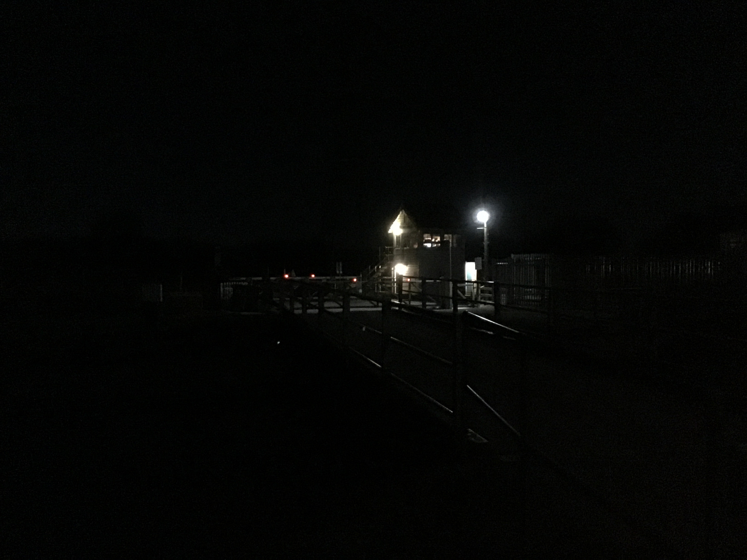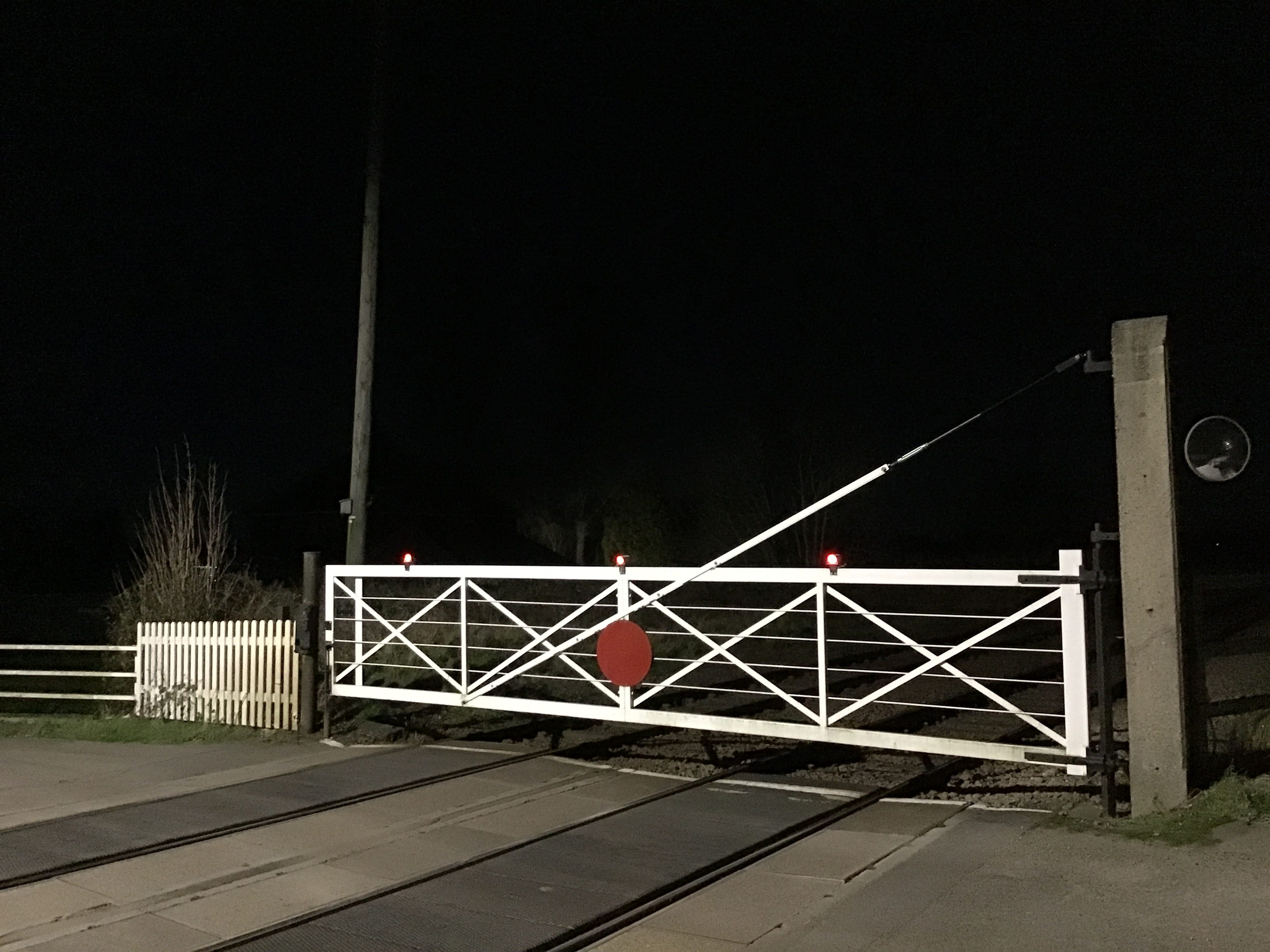 12.17am. Godnow Bridge. The signal box is dark and empty and the mechanical barriers are down. The road bridge is open. The railway is closed. Slowness in the shadowed apparatus and almost nothing to the wind. Hours from now, an hour before dawn, the labour of getting the parts moving again.