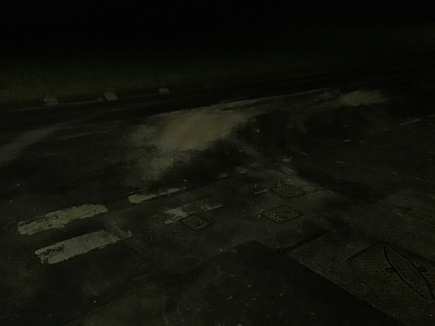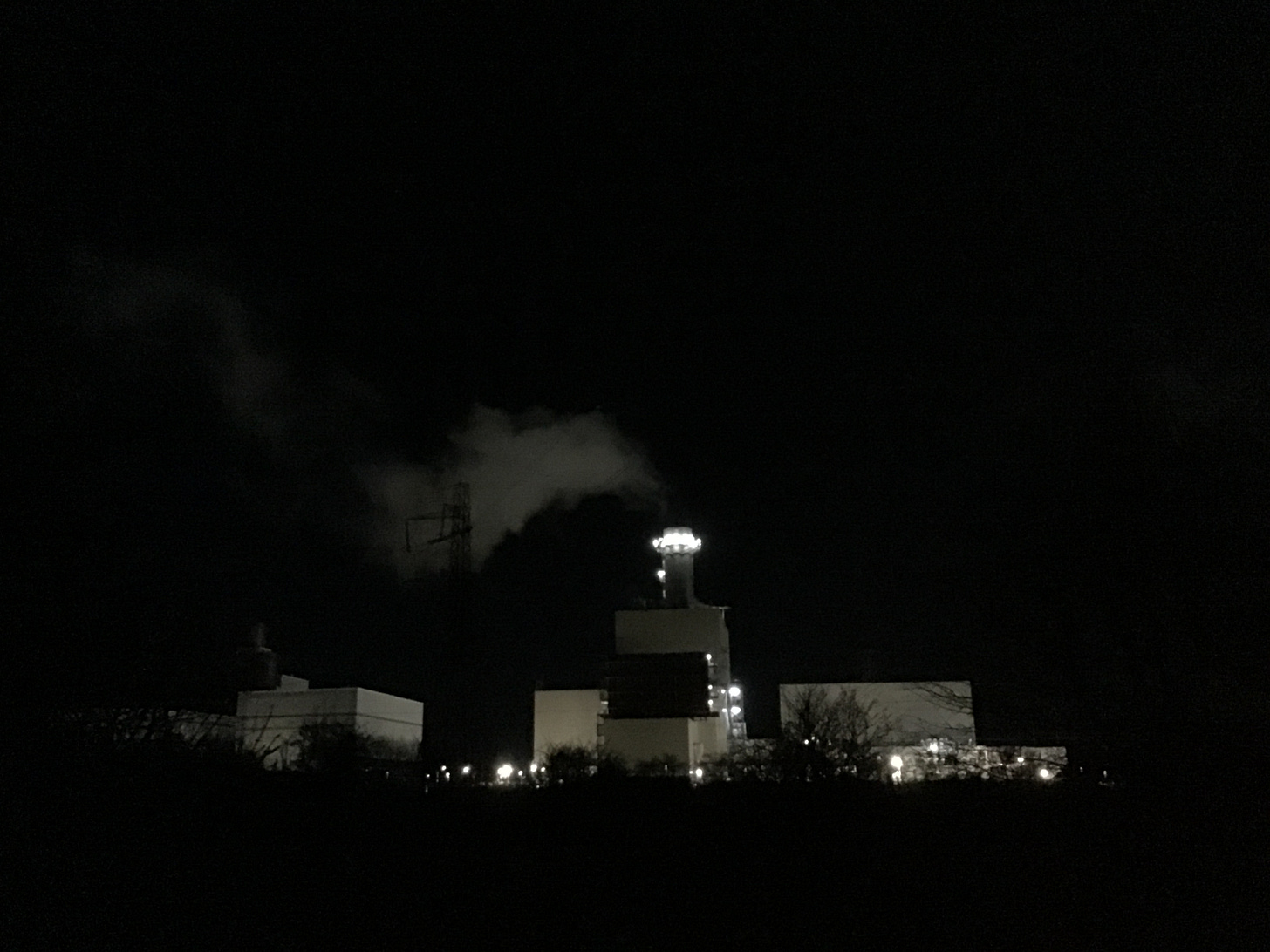4.10am. Thick white glare in the distance. So thick that I can’t read the distance. Then no distance at all. I step into the northbound verge and see it for what it is, at actual size, a pumping station for the Paupers’ Drain, multiple structures, concrete and brick, all sides lit.