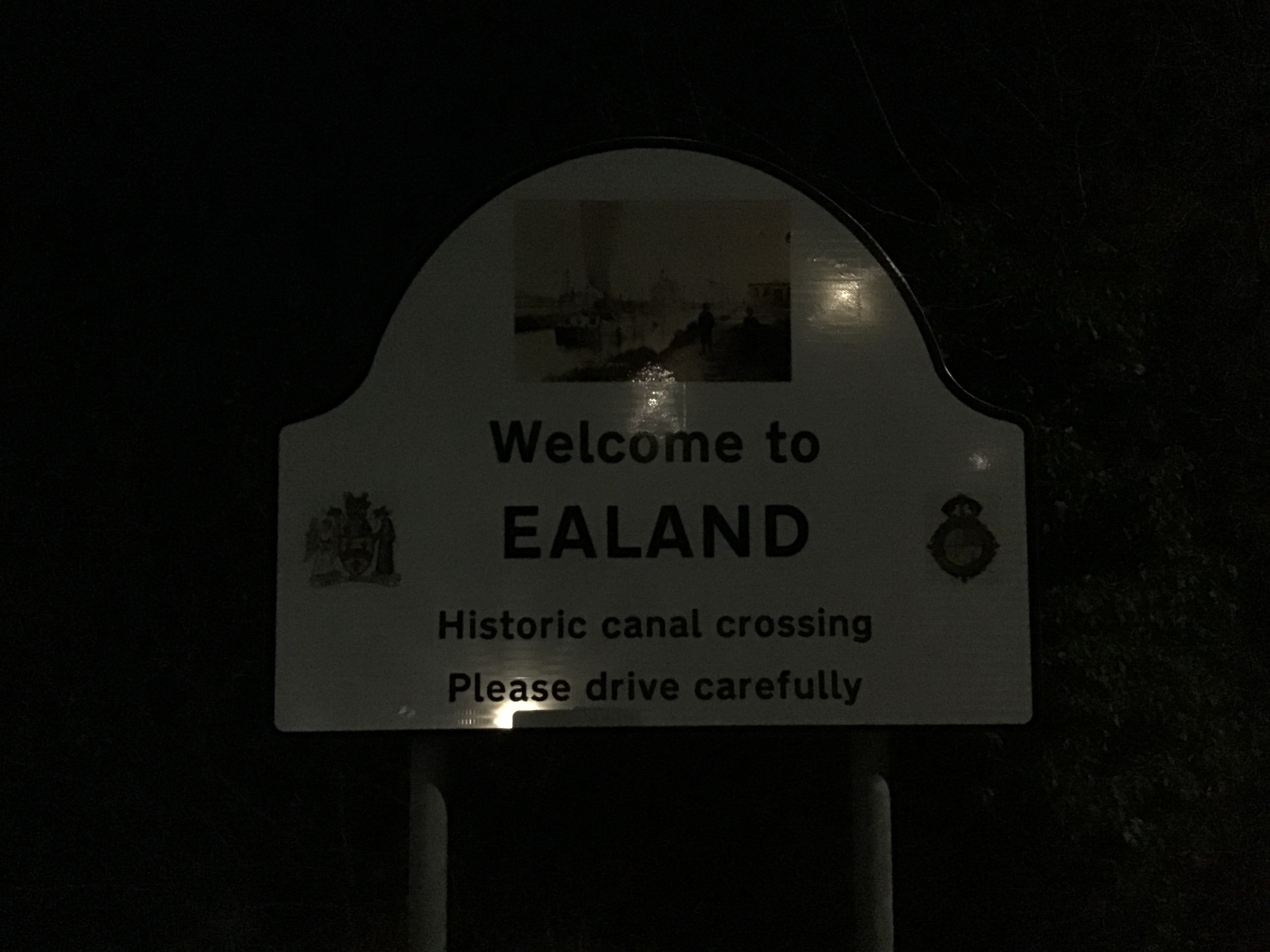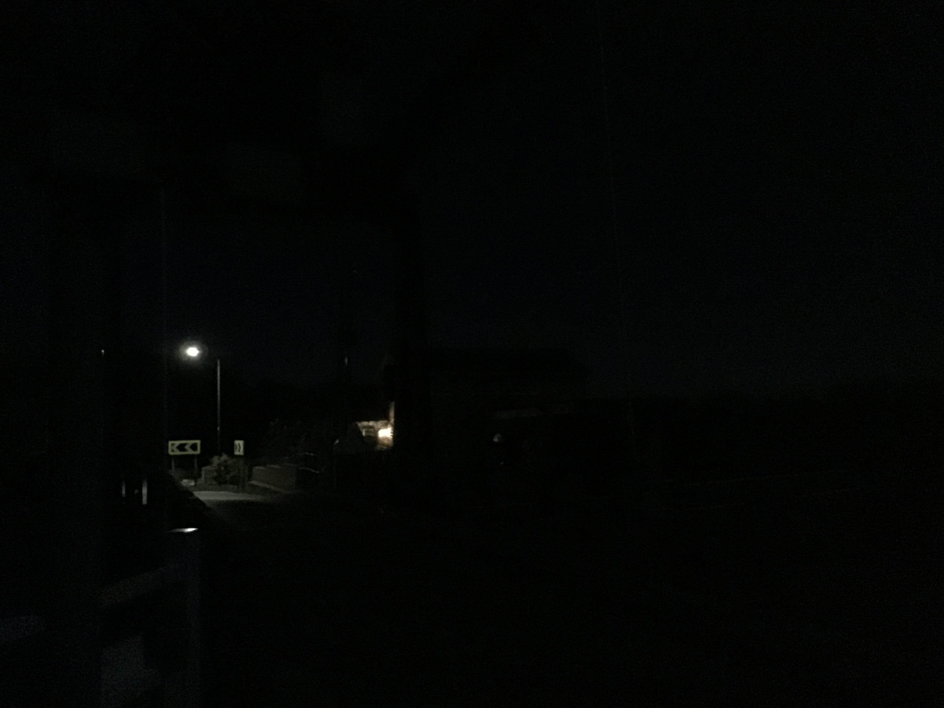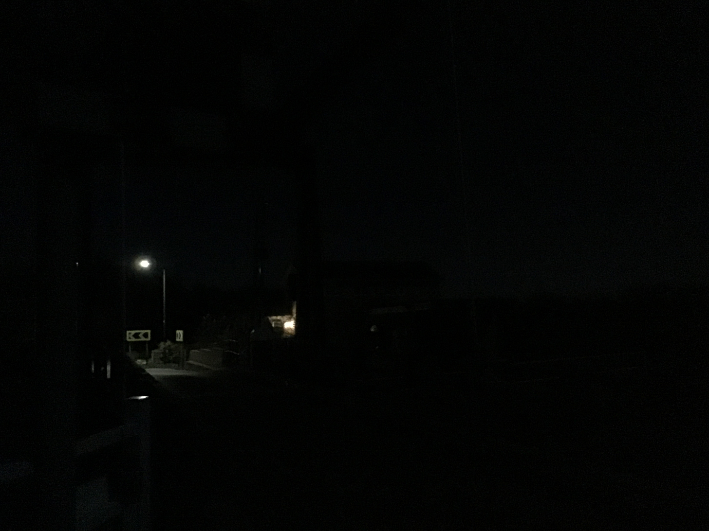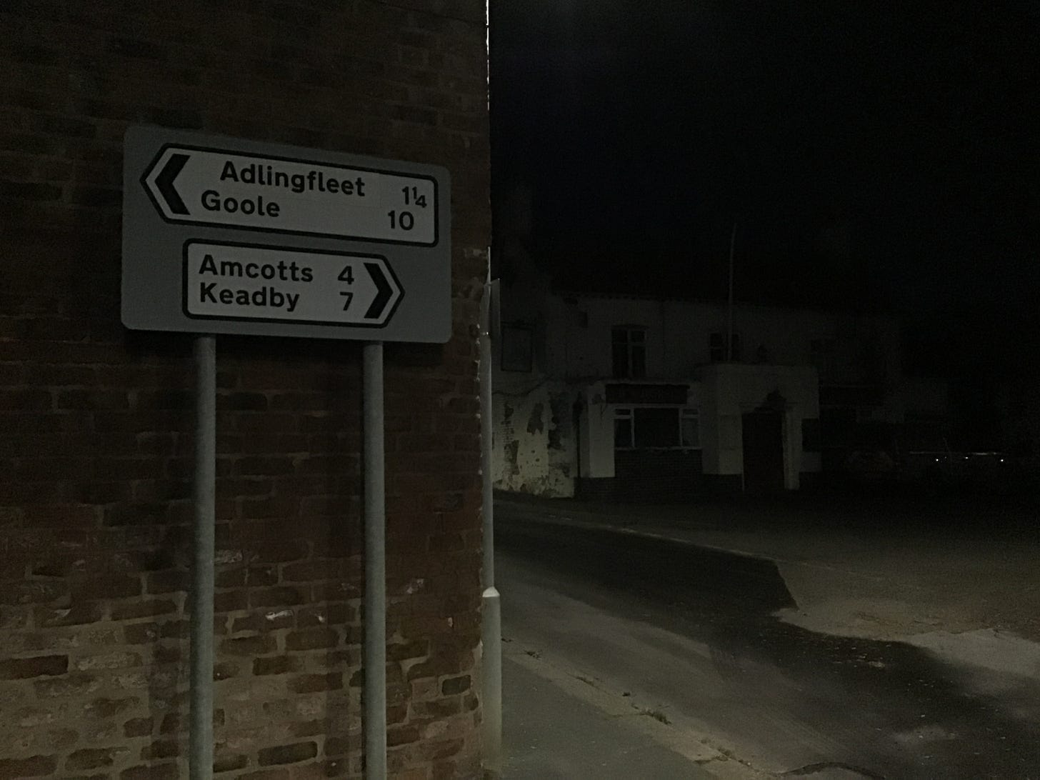 3.25am. Every ten minutes I turn back and see that Keadby has maintained its size with the passing intervals and still no Amcotts ahead. Eventually the lights and a left turn from the river and a sign scarcely legible. The ambulance from earlier is still winding through the lanes at half speed.