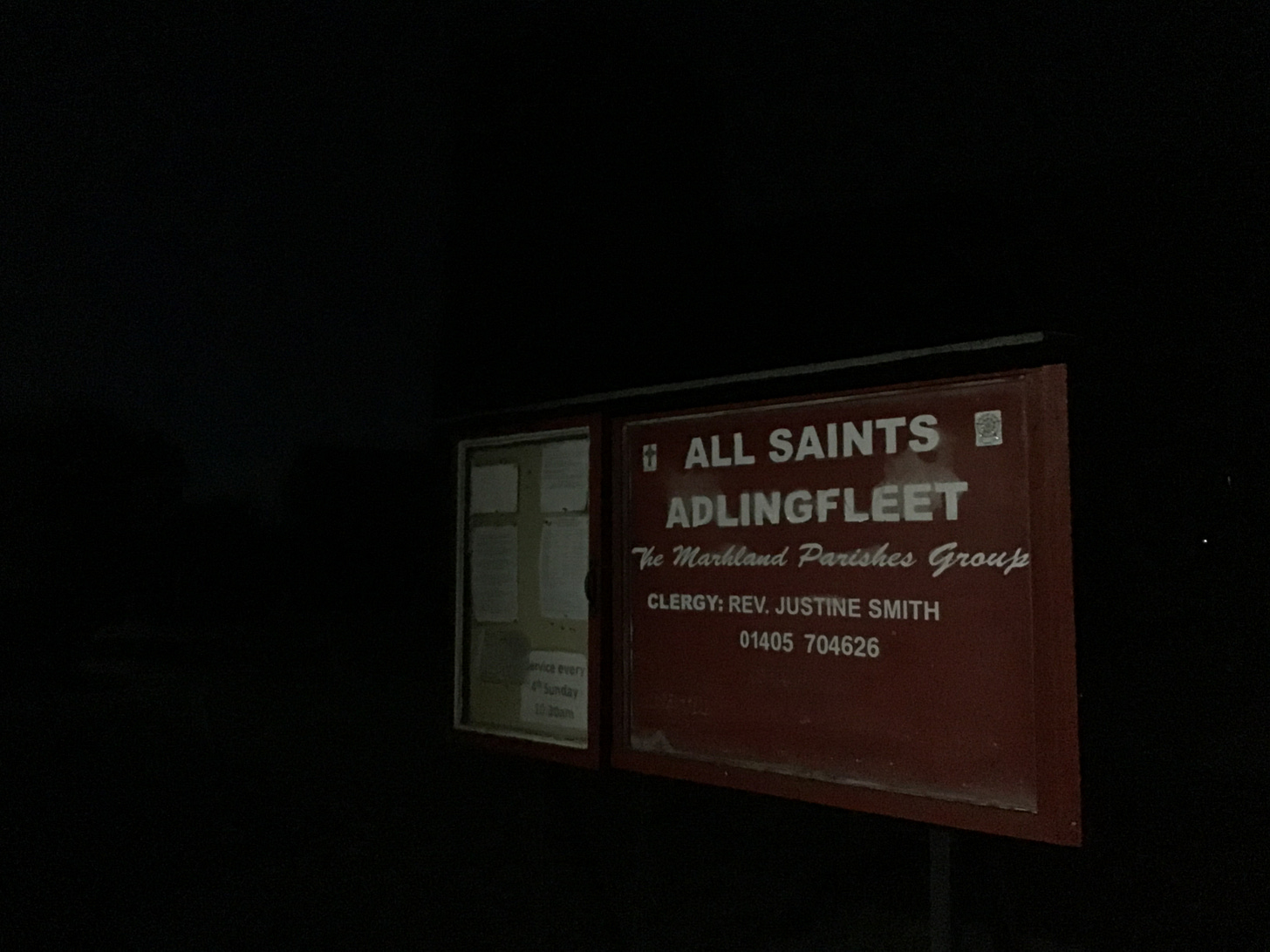 6.20am. Ousefleet. I missed the sign for the East Riding. Before or after Adlingfleet. Or nowhere at all. I try to make out the anti-pylon message on a crumpled vinyl banner but the folds are stuck fast. It is cold. Colder than midnight. Windows and gardens aglow. Light without heat. None of it touches me.