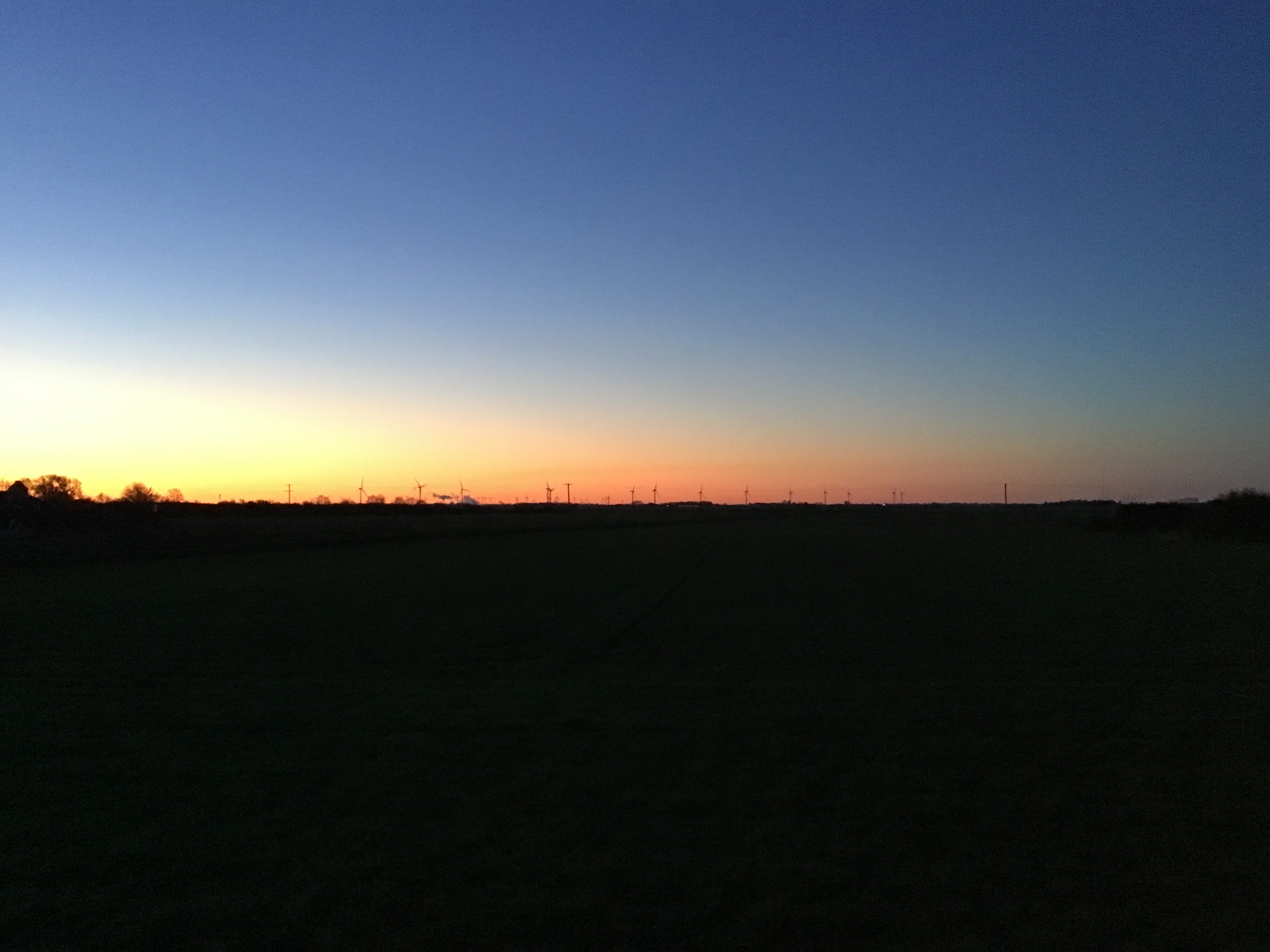 10.37pm. The first few turbines, faint as greyscale, 50%, 40%, 30%. No reflective light. No colour contrast. Scarcely a breeze on the towpath but the rotation in the moorland is clear. Keep moving. Don’t stop. I loosen the flaps of my hat and listen to the blades scything the darkness.