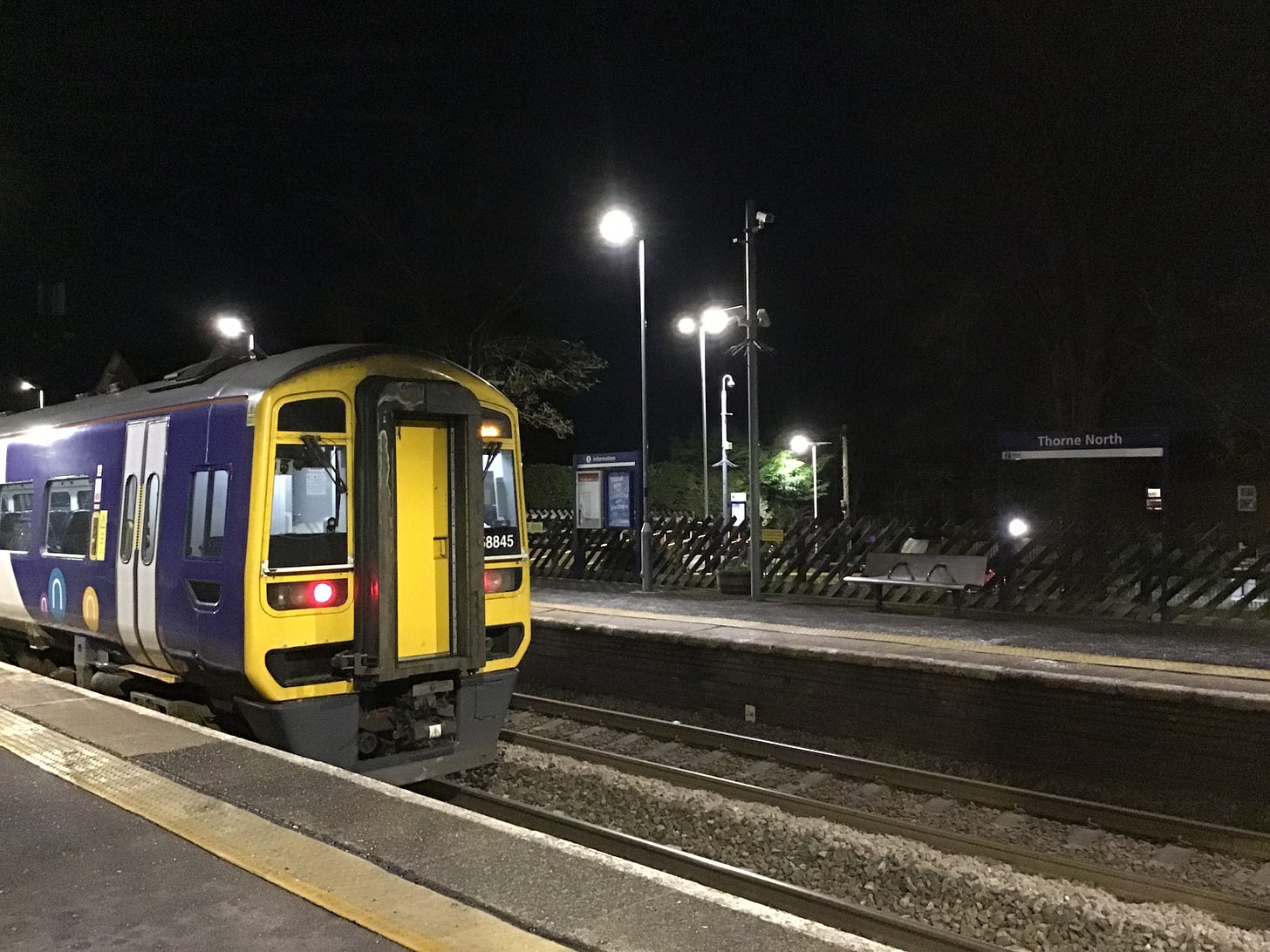 8.38pm. Doncaster. I disembark and scramble down the steps from platform 8 and into the underpass then resurface in the ticket hall and scan the departure boards. Delays. Cancellations. Northbound. Southbound. Half the network freezing up. I find the train to Thorne. 9.07pm. Platform zero.