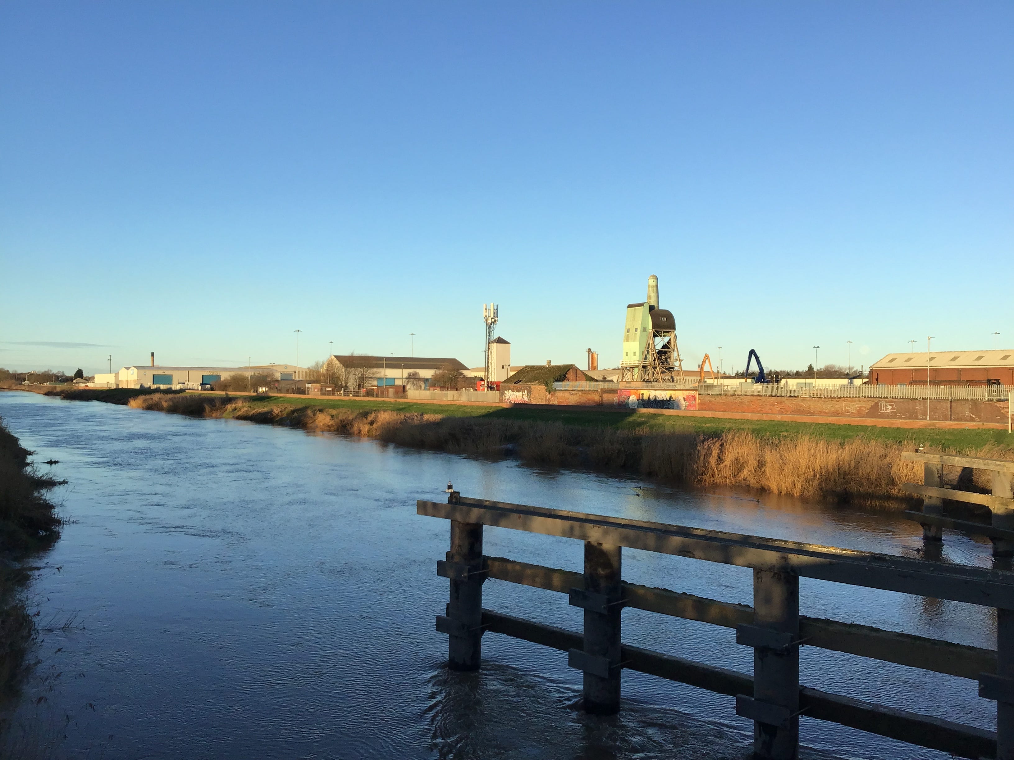 8.20am. I scale the embankment and look out at the Ouse and across the Ouse and through the five hundred acres of warp silt known as Sandhall Farm until I find the dockside industries on the other side of the meander. Goole by any measure. The water towers, the grain silos, the parish steeple.