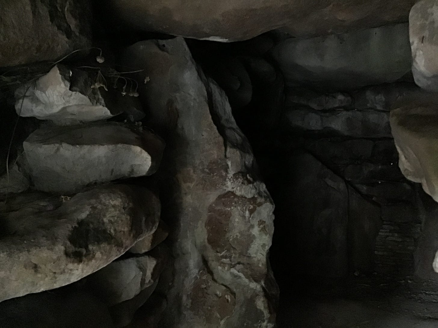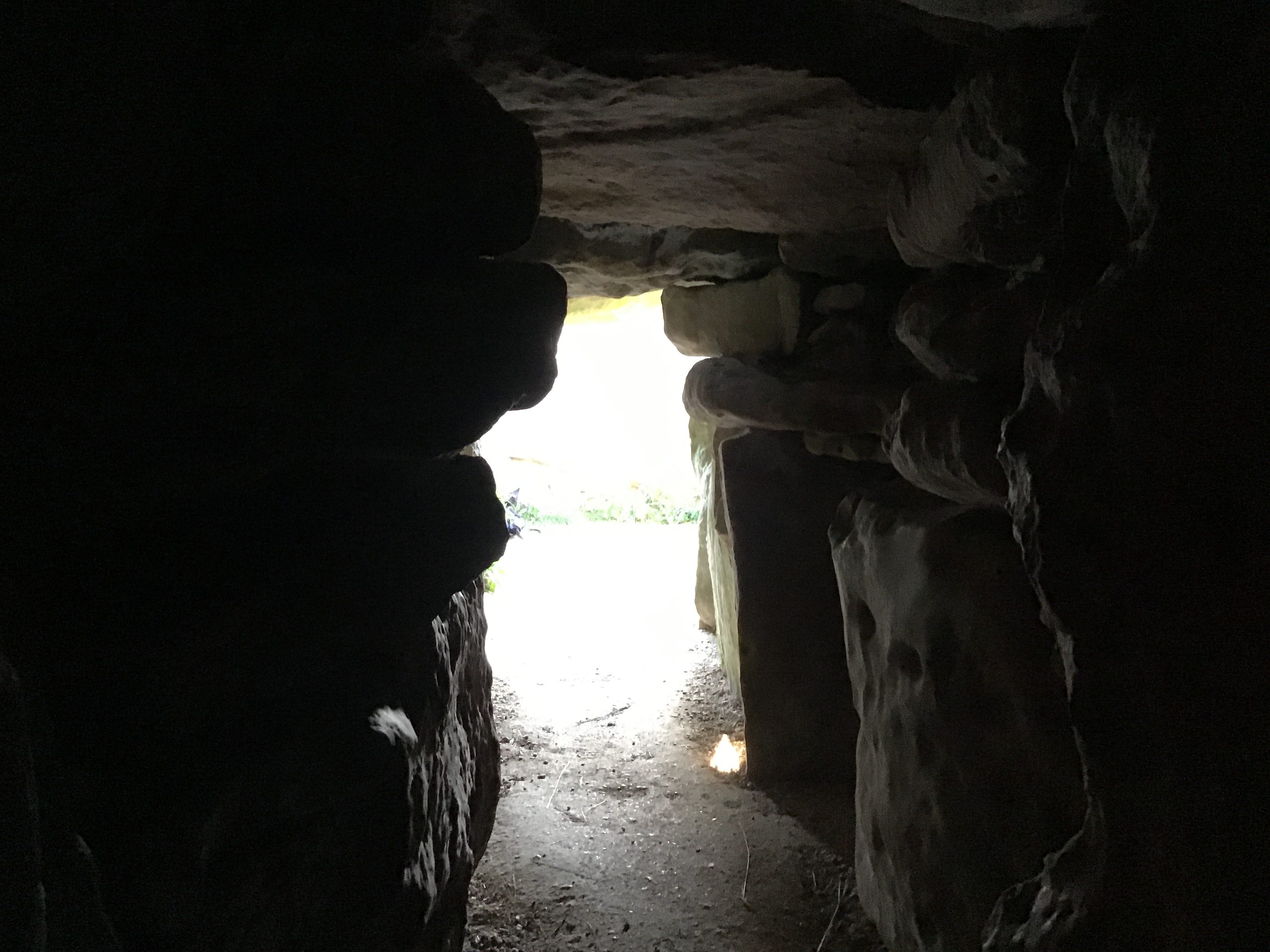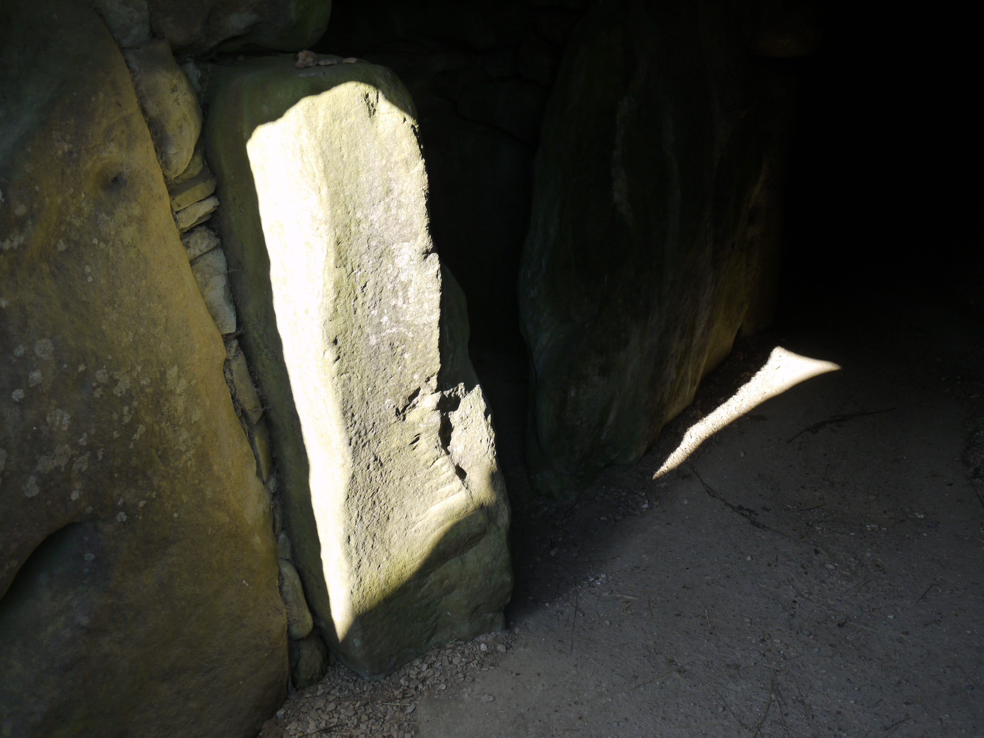 Tealights and wheat ears in the west chamber, dried flowers on the lower ledges. I have brought no offerings. I pace the length of the barrow, back and forth, and then, after a few minutes, stop at the threshold, lost in the play of light on stone.