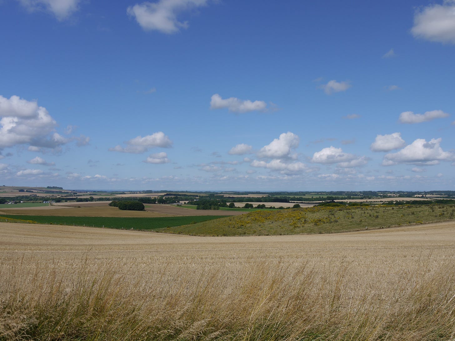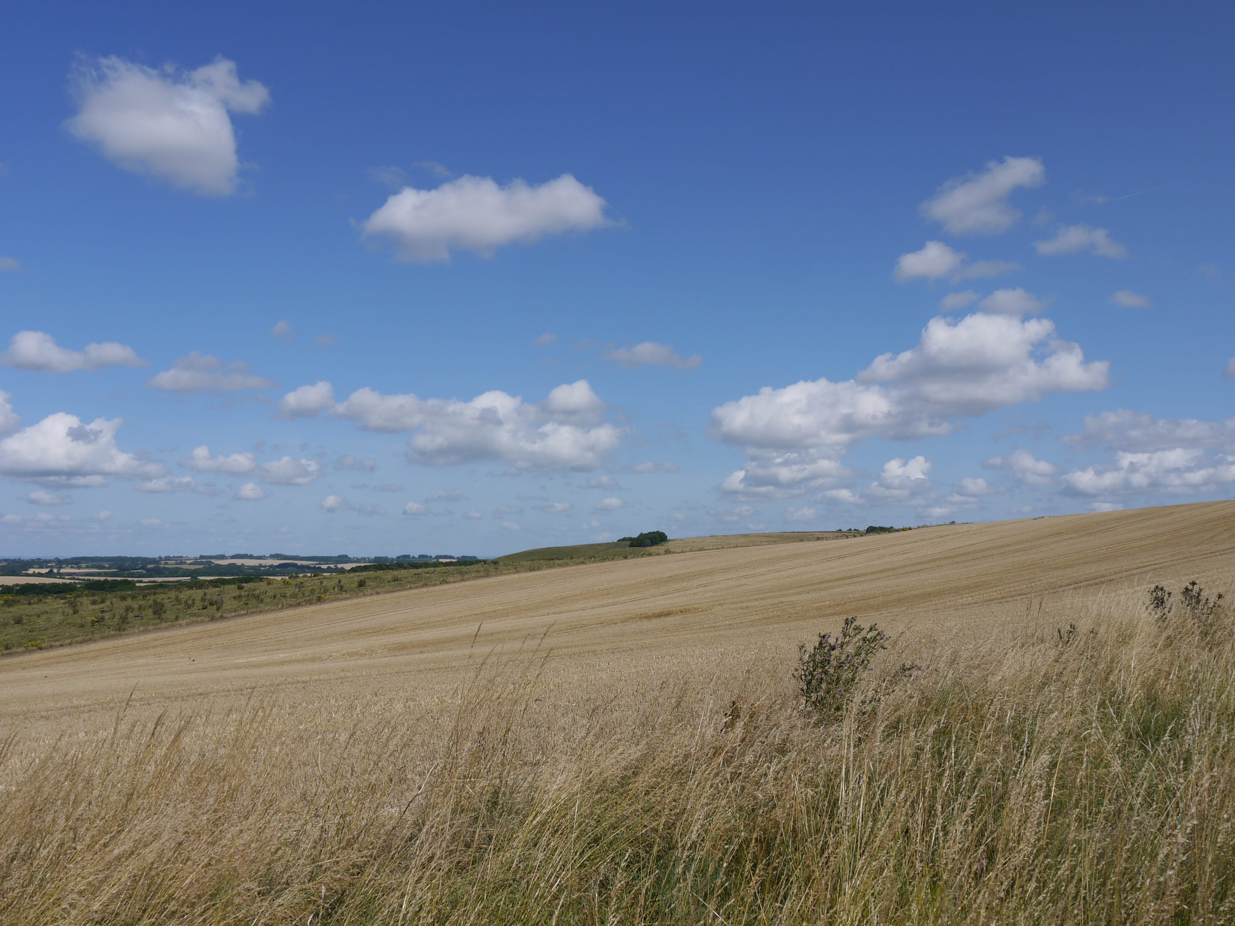 10.55am. Dry, rutted tracks. An uneven ascent. I look west towards Broad Town and Broad Hinton, where my father spent the first year of his life, a little house somewhere off the High Street, he and my brother tried to find it, years later, but drew a blank. The path curves east.