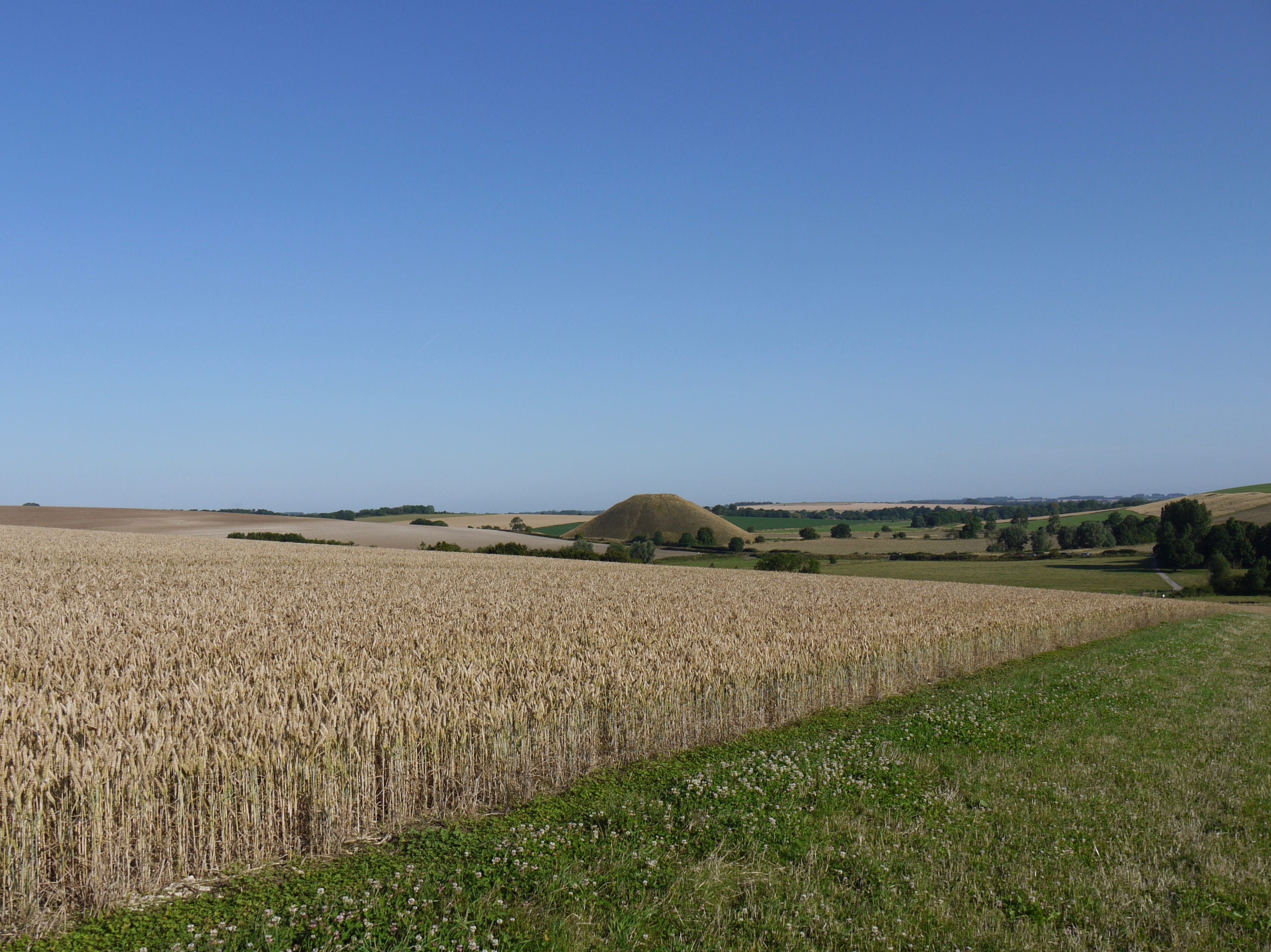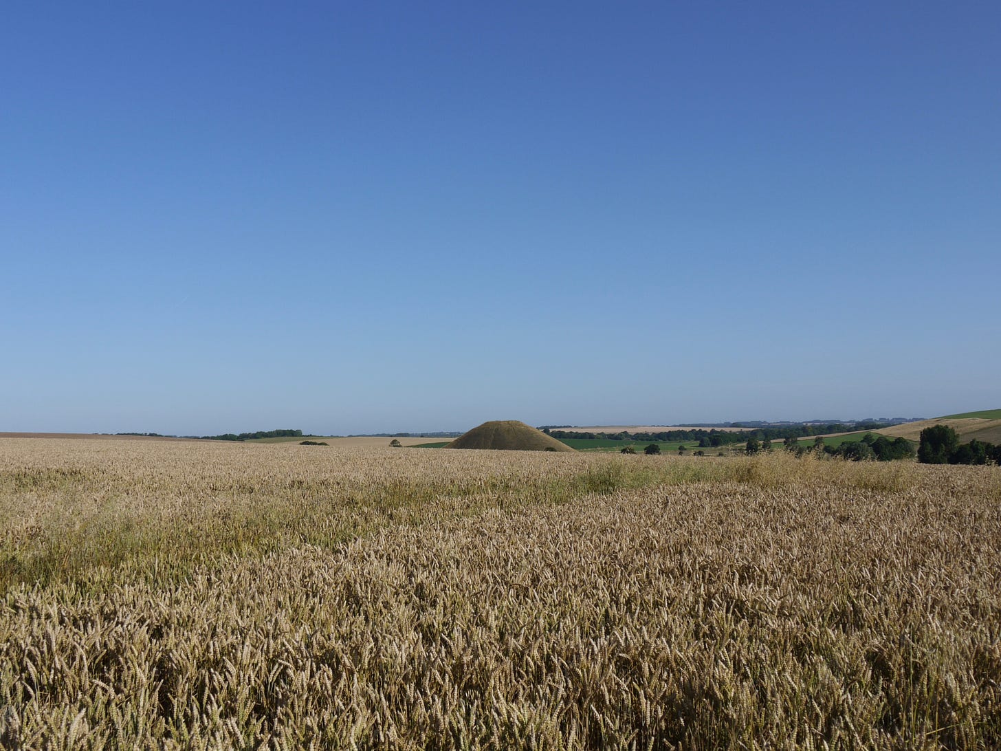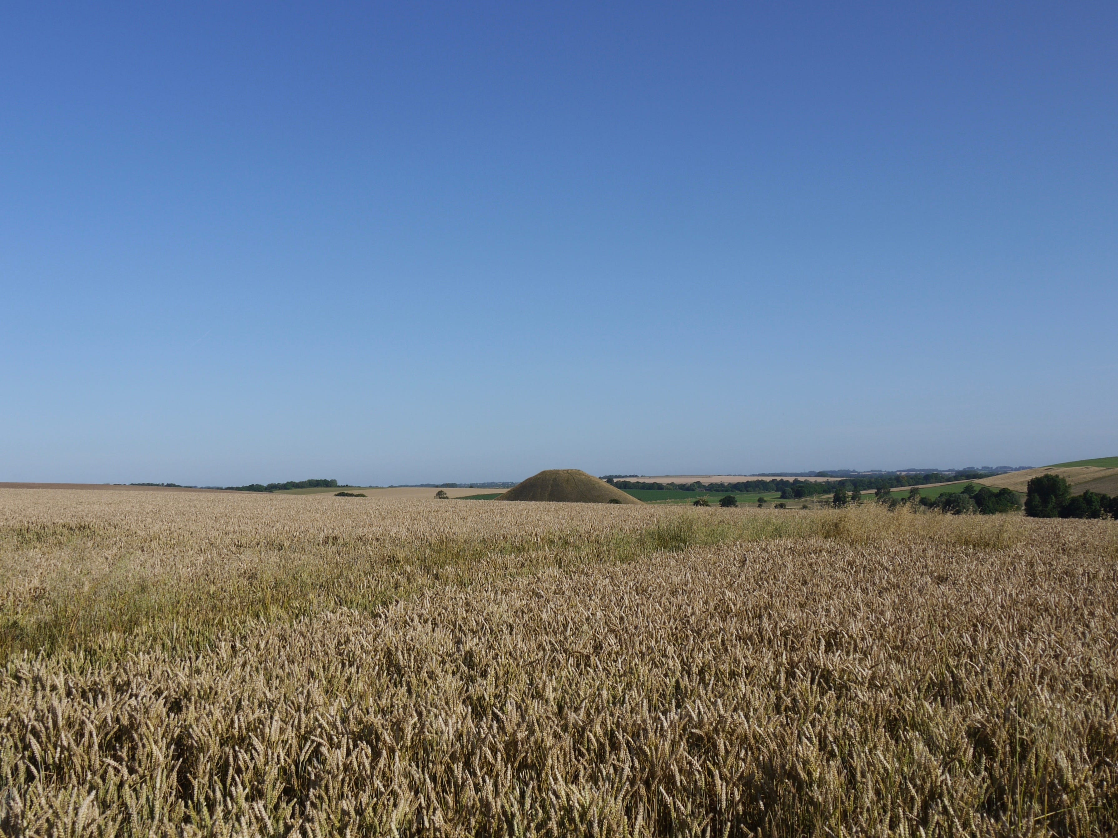 The barrow stretches into the west, eight times the length of the stone chamber, the rubble, chalk and grass embankment receding into blue distance. The swallows are out of the picture. I pluck an ear of wheat from the field's edge and start back down the hill.